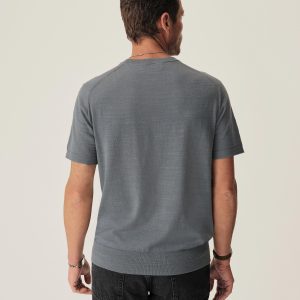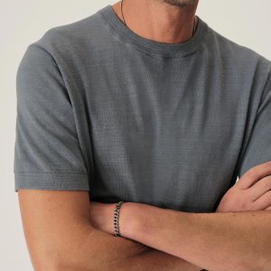 Classic fit short sleeve sweater tee with a straight hem. Yarn-dyed 16 gauge cotton jersey features light slub texture. Features double layer 1×1 ribbing at the collar and rib finishing at the cuffs and hem. Constructed with hand-linked seams for improved durability.