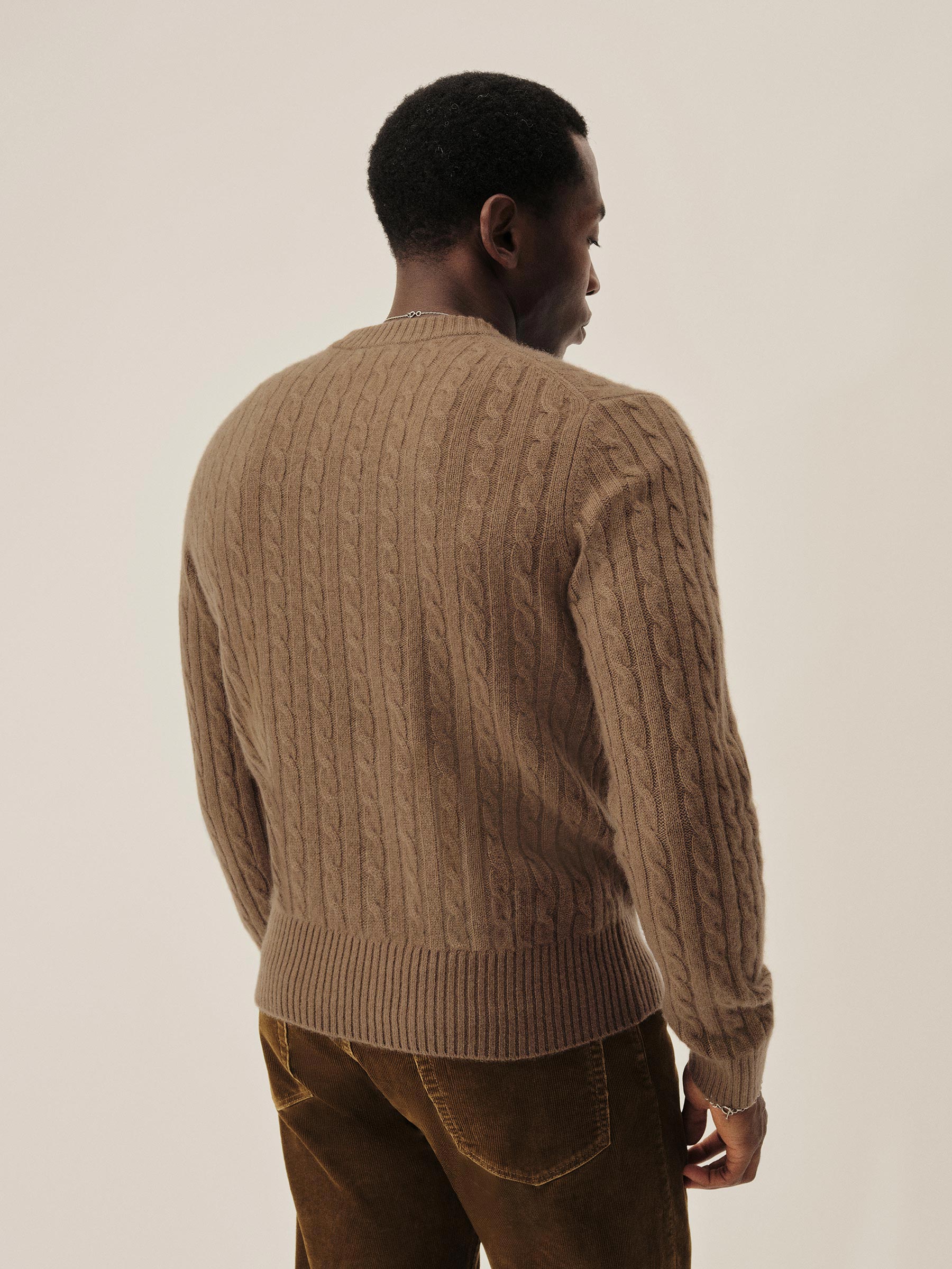 The California Cashmere Cable Crew is spun from 100% long-staple cashmere and knit in a refined 12-gauge cable pattern. Inspired by the casual poise of 1960s Ivy League sweaters, it’s finished with yarn-dyed ribbing at the neck, cuffs, and hem, and garment-rinsed for a soft, lived-in feel.
