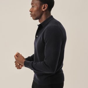Slim fit long sleeve sweater polo in a 16 gauge jersey knit from yarn-dyed long staple cashmere. Details include a three-button placket with shell buttons and ribbing at the cuffs and hem. Constructed with hand-linked seams for durability.