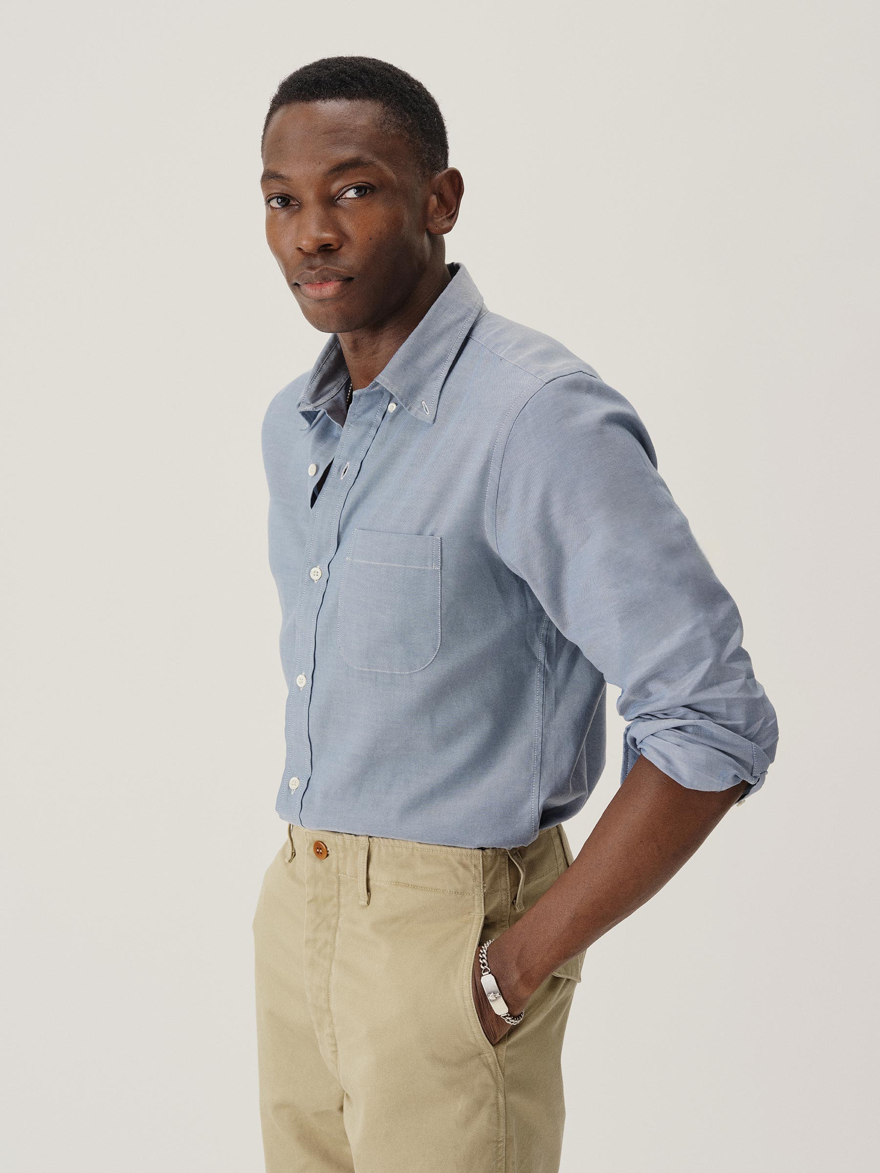 Classic fit button down collar shirt cut from a proprietary 3 oz blend of cotton and tencel. Details include mother of pearl buttons, a single scallop pocket, and a box pleat at the back. Constructed with clean finished seams. Garment washed for a lived-in look and feel.