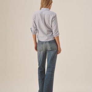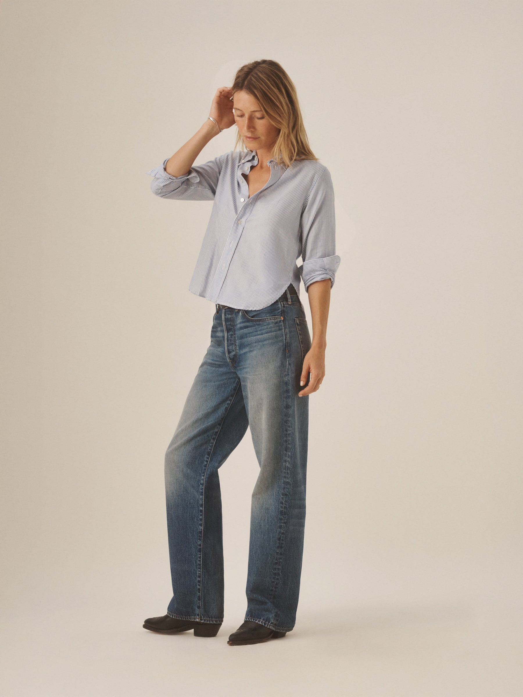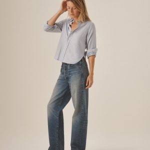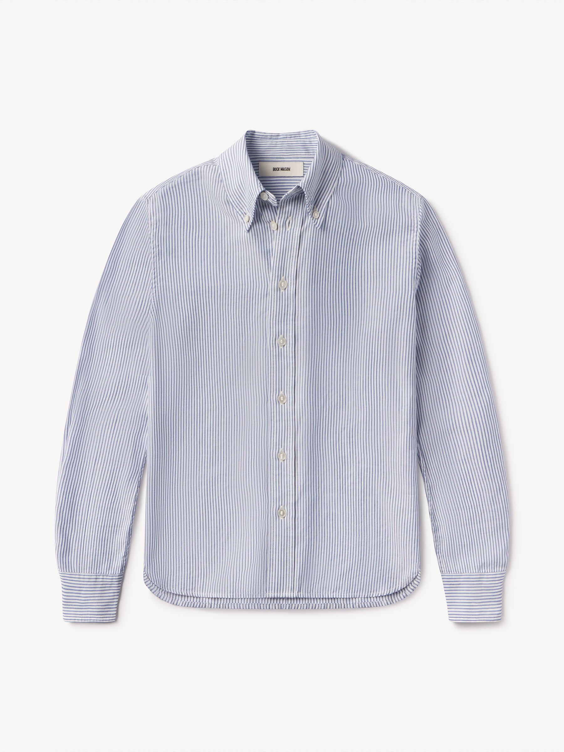 Inspired by 1950s men’s dress shirts, an Oxford cut from a natural, yarn-dyed fiber blend with a soft hand and crisp structure. Our slimmest shirt yet, it’s designed with a button-down collar that holds the perfect roll, stacked mother-of-pearl buttons, and felled seams for durability. Details include knife pleats at the cuff, a box pleat at the back yoke, and a shrunken silhouette made to layer under a blazer or wear solo.