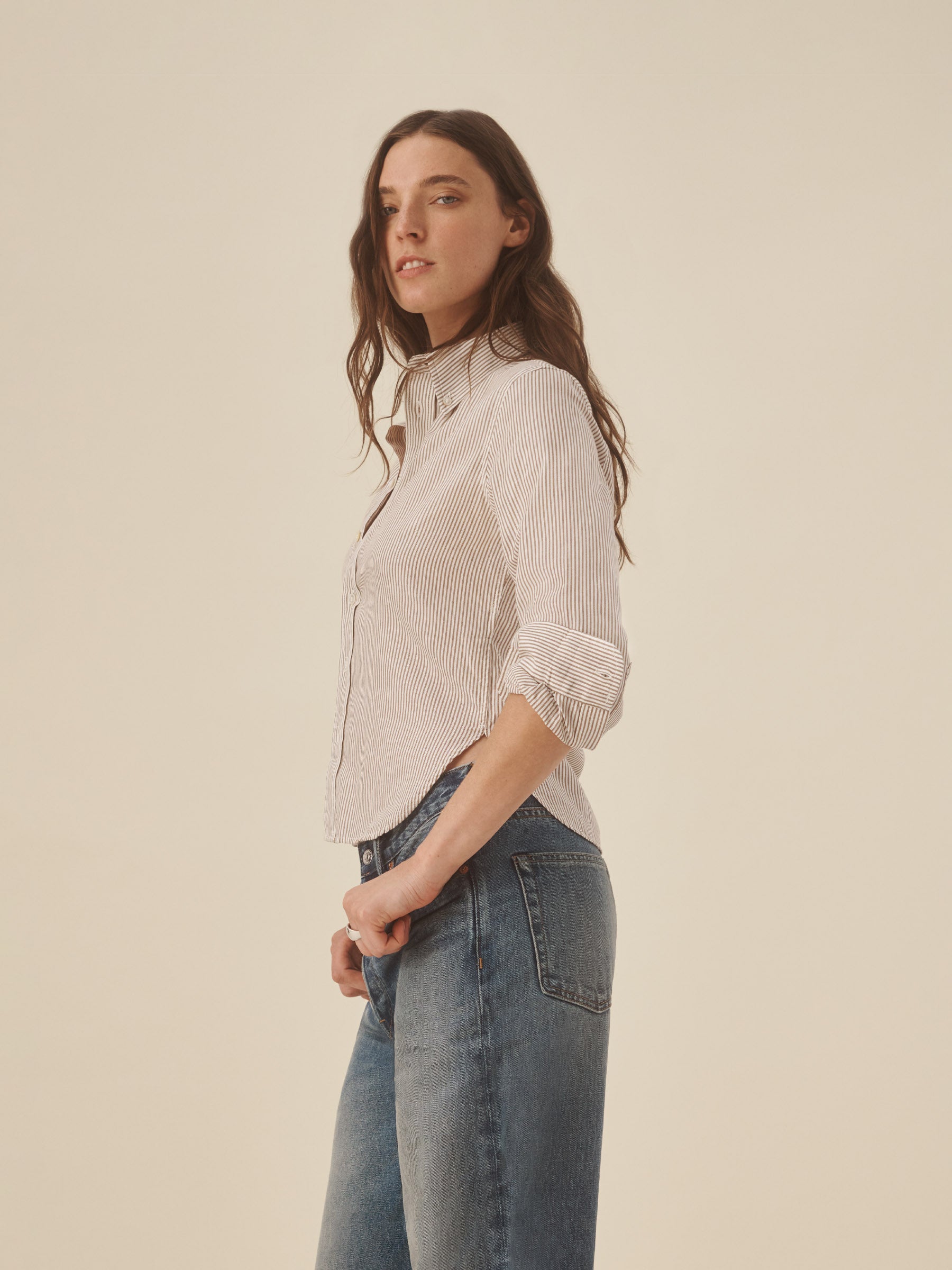 Inspired by 1950s men’s dress shirts, an Oxford cut from a natural, yarn-dyed fiber blend with a soft hand and crisp structure. Our slimmest shirt yet, it’s designed with a button-down collar that holds the perfect roll, stacked mother-of-pearl buttons, and felled seams for durability. Details include knife pleats at the cuff, a box pleat at the back yoke, and a shrunken silhouette made to layer under a blazer or wear solo.