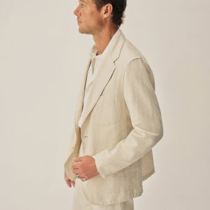 The Carry On Jacket is designed to be casual enough to wear by itself or step up into a full suit with matching trousers. It’s constructed with a classic three-roll, two-button stance with a welt chest pocket and two patch-and-flap pockets at the hip. With no lining or back vent, the jacket is decidedly casual and streamlined. This iteration is made from a light and breathable blend of cotton and linen with a subtly textured herringbone weave.