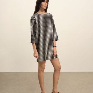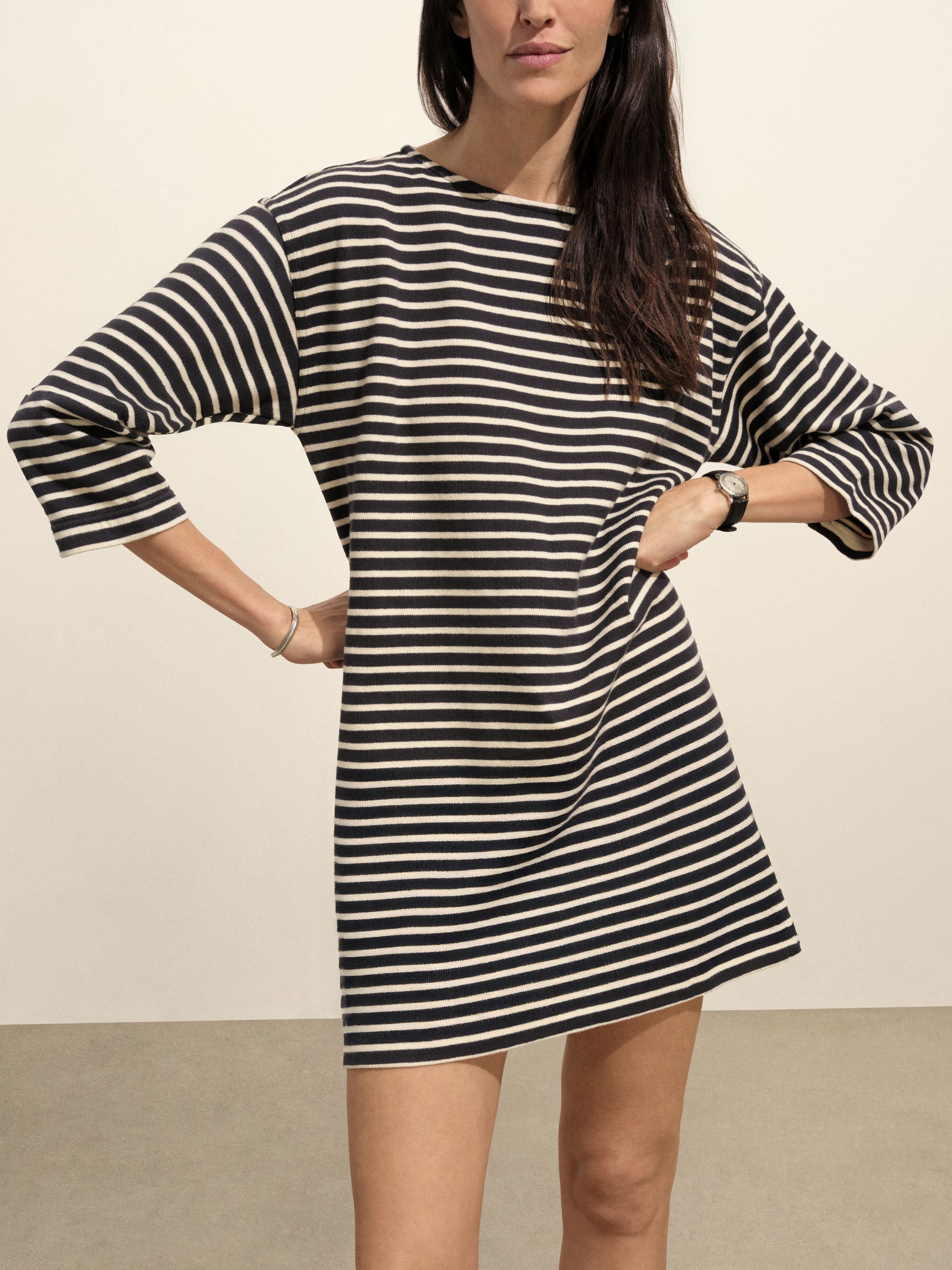 Inspired by classic French Breton stripe shirts, a relaxed boatneck shift dress with long sleeves, made from heavy cotton jersey. Detailed with herringbone tape along the side slits and neckline and finished with a garment wash for a soft, broken-in feel.