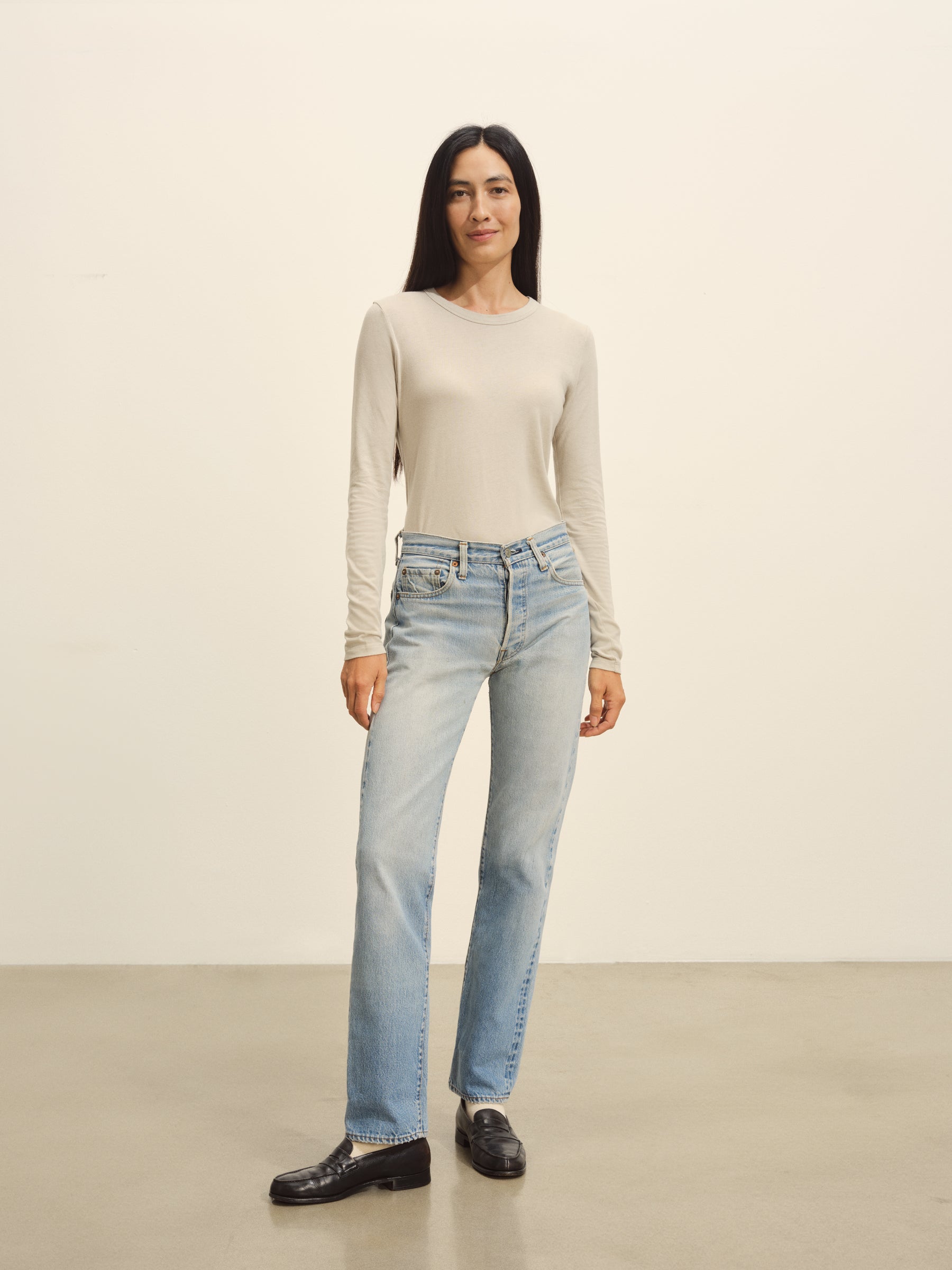 Slim fit long sleeve crewneck tee cut from a supersoft 130 GSM blend of bamboo, cotton, and wool. Features a straight hem, a self bound neck, and raised armholes that hug the contours of the shoulders. Garment washed for a lived-in feel.