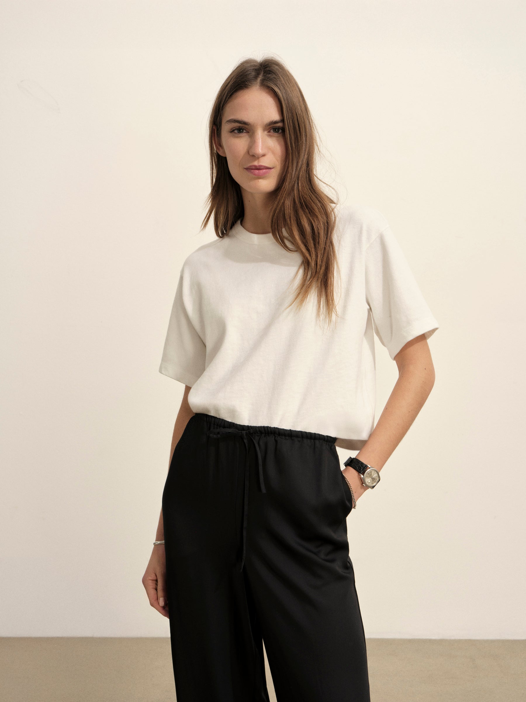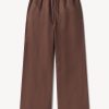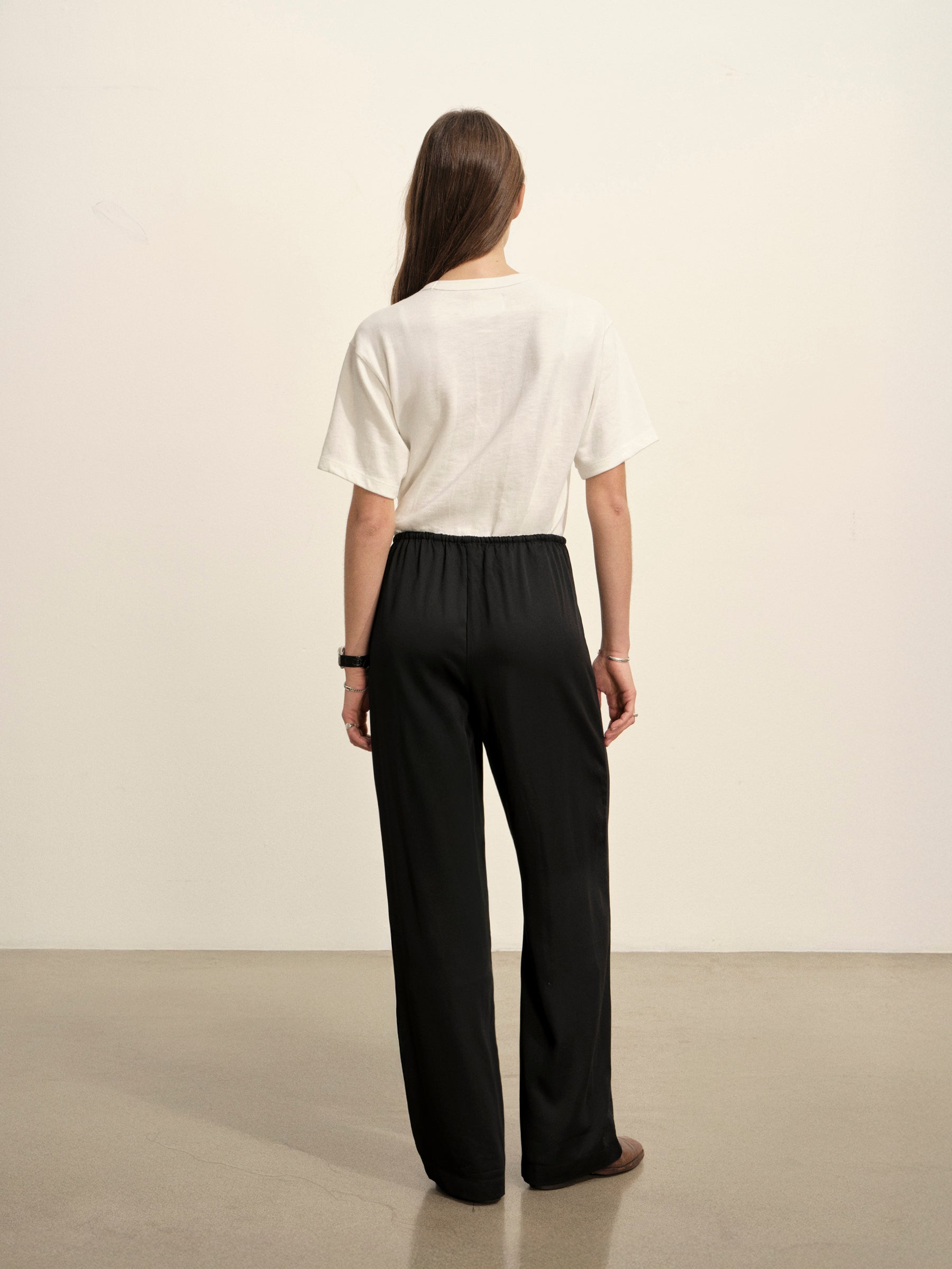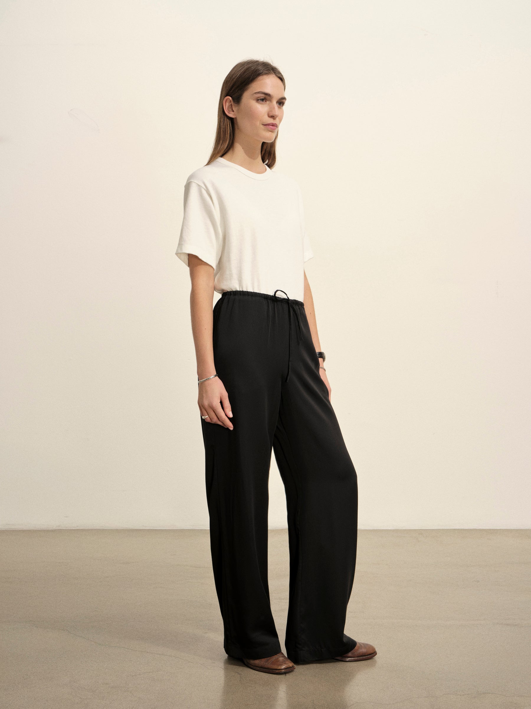 A silky, smooth rayon pull-on pant with a high-rise, straight leg, and an elastic drawcord waistband. Featuring hidden on-seam pockets, French seams, and garment washed for softness.