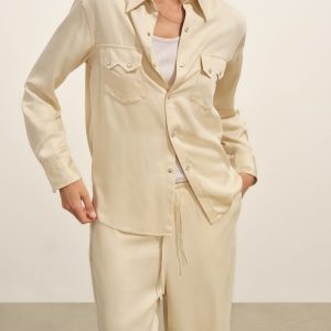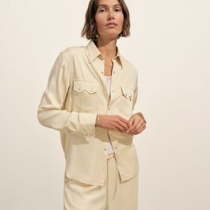 A silky, mid-century-inspired Western shirt with a relaxed body, distinct sawtooth pockets, and an arched back yoke with pleats. Cut from rayon modal and finished with French seams and pearl snaps.