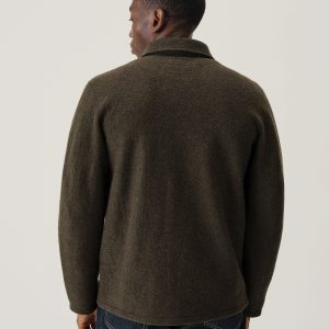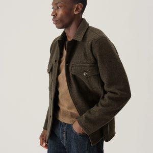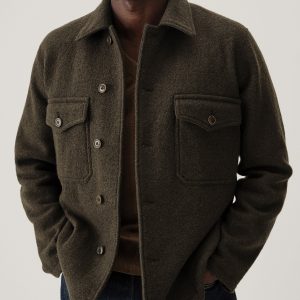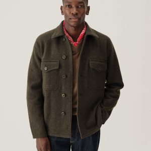 Classic fit field shirt in 340 GSM felted merino wool, twice boiled for improved insulation and durability. Details include patch-and-flap chest pockets and a button front closure. Constructed with hand-sewn facings and cover-stitching with flat seams for comfort.