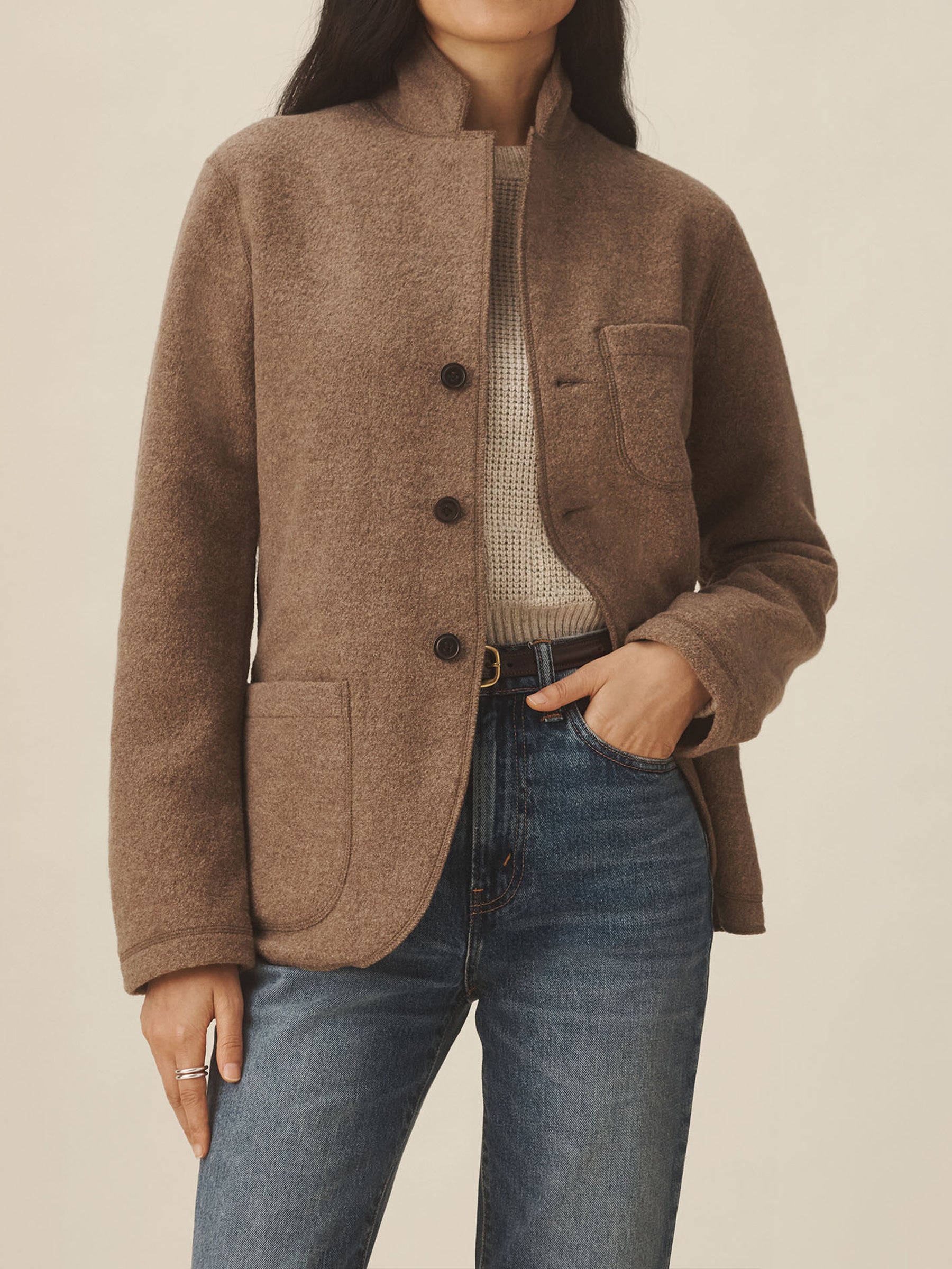 Classic fit chore coat with a slimmer cut through the arms and room in the torso for layering. This 340 GSM felted merino wool has been twice boiled for improved insulation and durability. Details include three patch pockets, horn buttons, and a notch collar. Constructed with hand-sewn facings and coverstitching throughout.