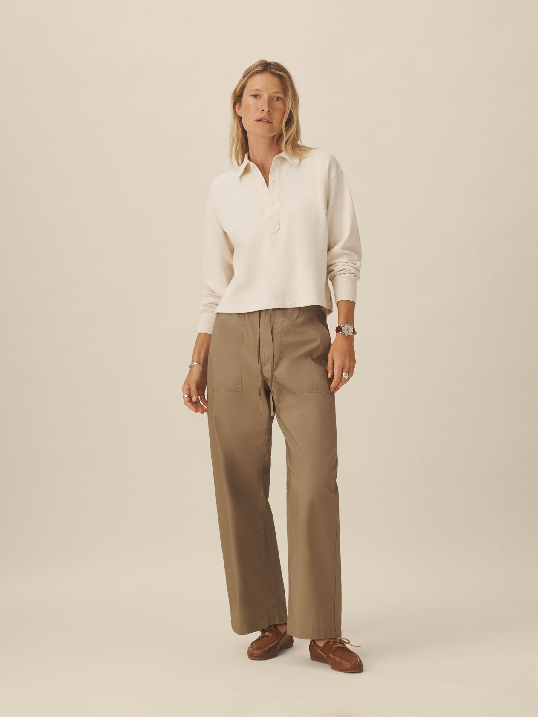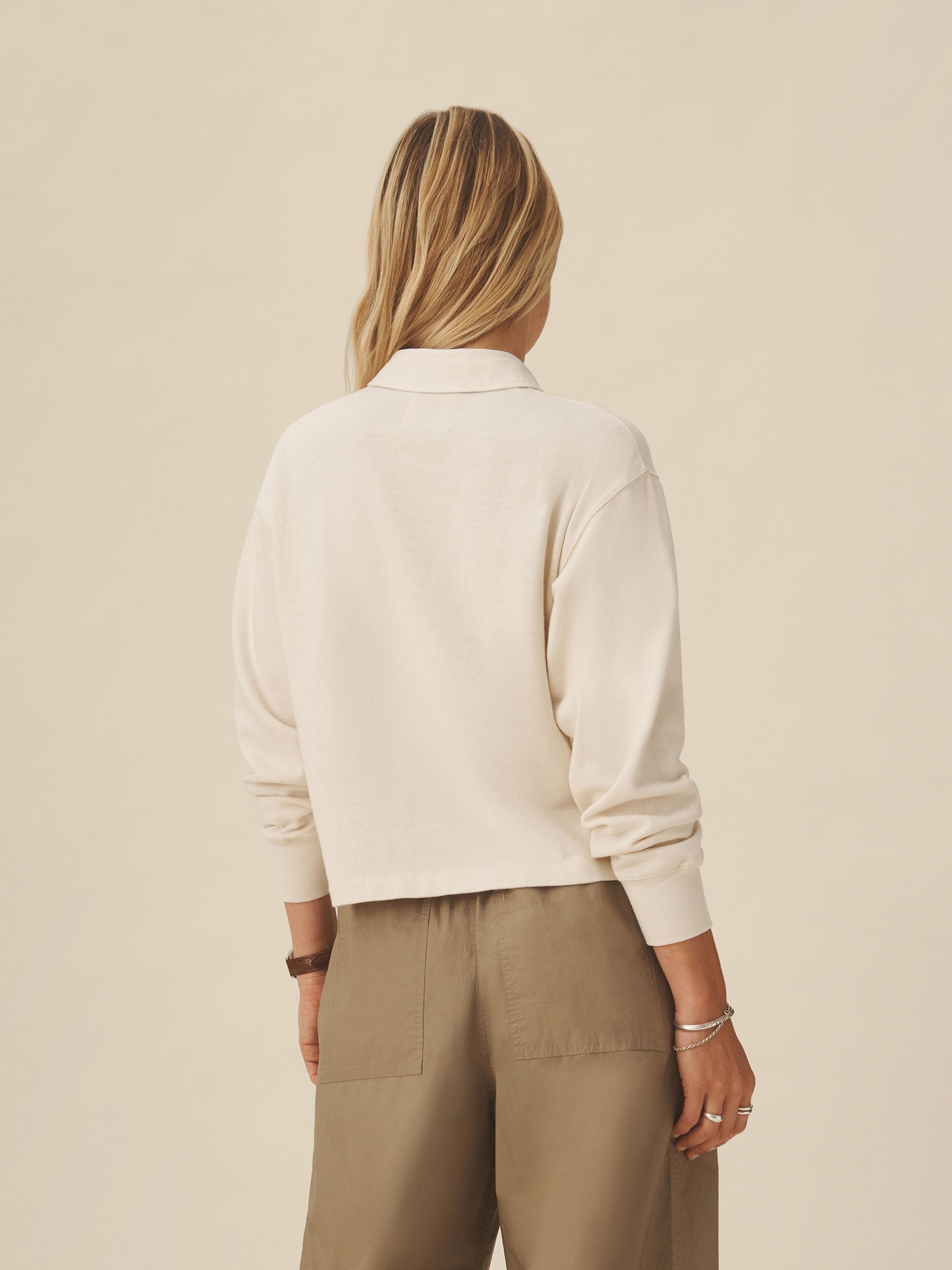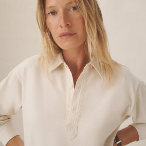 Inspired by the men’s Field-Spec Rugby, the women’s version is cut from 100% cotton in a dense slub jersey with a structured hand. Cut with a cropped, boxy fit and long sleeves, it’s designed with a woven twill collar and placket, tonal poly buttons at the center front, and herringbone-trimmed side slits.