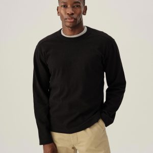 A relaxed, long-sleeved, heavyweight cotton tee modeled after a vintage rugby shirt. The soft cotton jersey is about twice as heavy as our Pima tee, with tiny vertical ribs that gently glide across the skin. This is a solid, substantial stand-alone tee for cold weather.