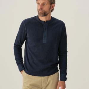 Classic fit long sleeve polo cut from yarn-dyed 310 GSM cotton jersey with the weight and durability of vintage rugby cloth. Details include a stepped hem with side seam vents, a three-button placket with shell buttons, and ribbing at the cuffs. Garment washed for a lived-in feel.