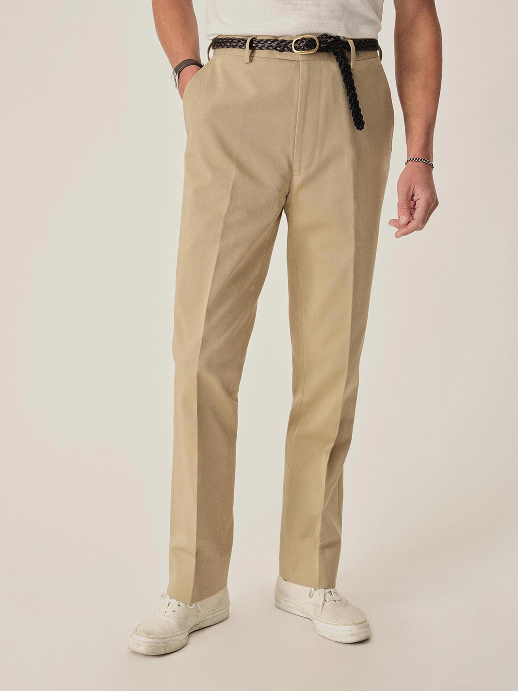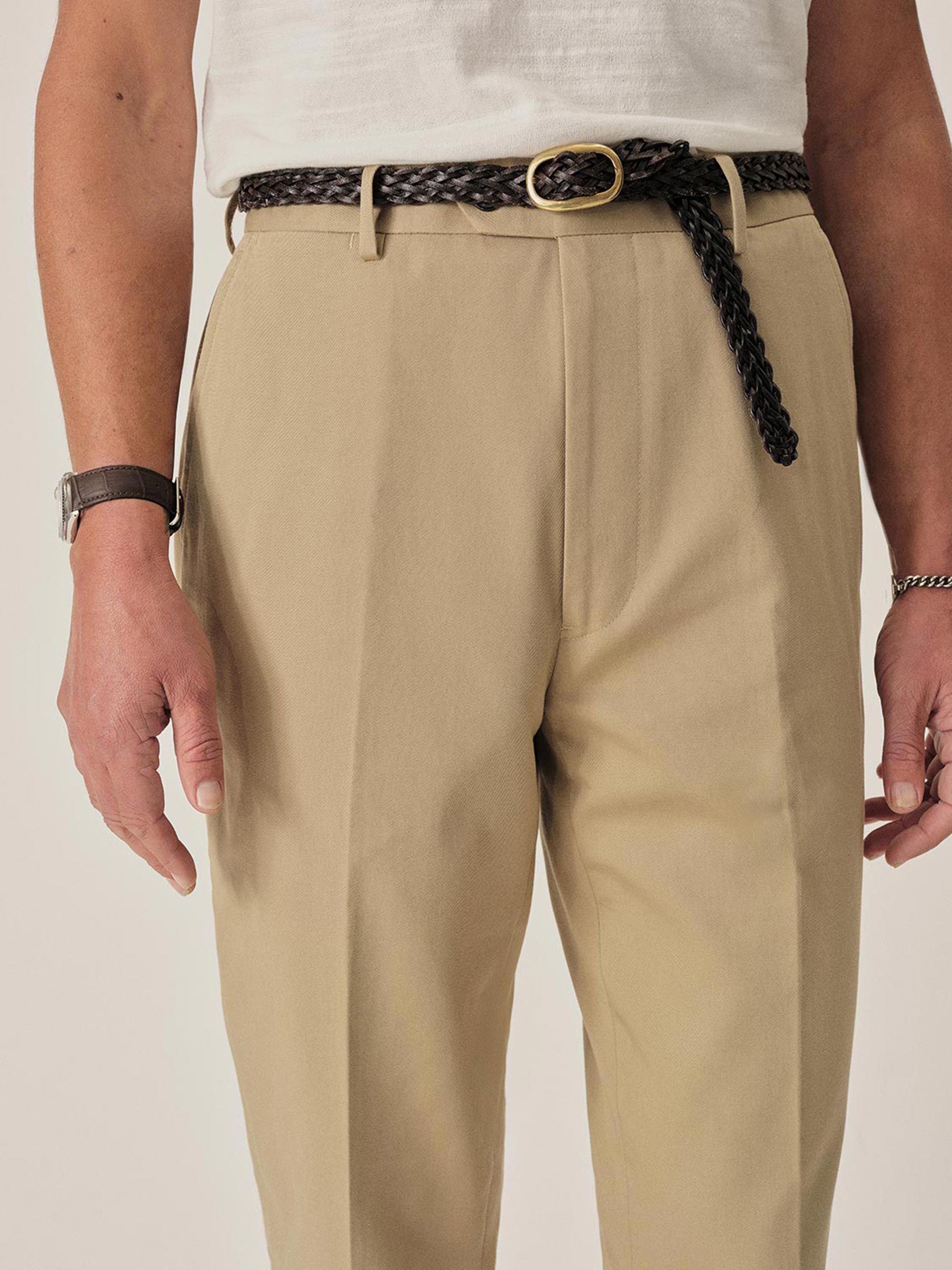 Tailored tab-waist trouser inspired by traditional Ivy style tailoring. Cut from an Italian cotton twill ideal for spring and summer, providing lightweight structure with a uniform appearance. Features a flat front, buttoned tab waist and hook and eye closure. Slash side pockets, on-seam coin pocket, two welt back pockets. Front lined through the knee for comfort. 35″ unfinished hem. Pair with our Graduate Blazer for a full suit.
