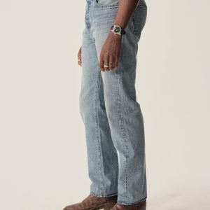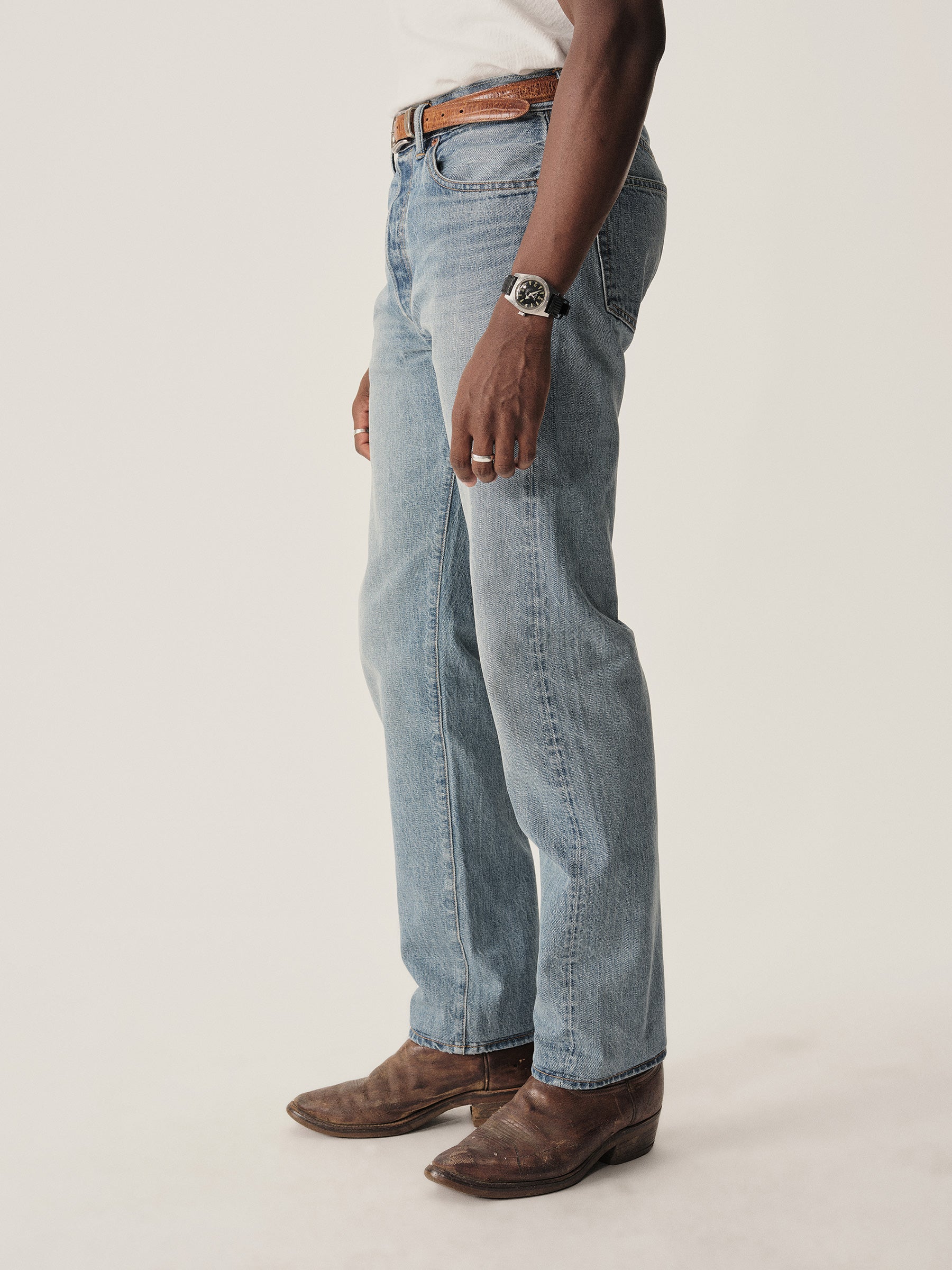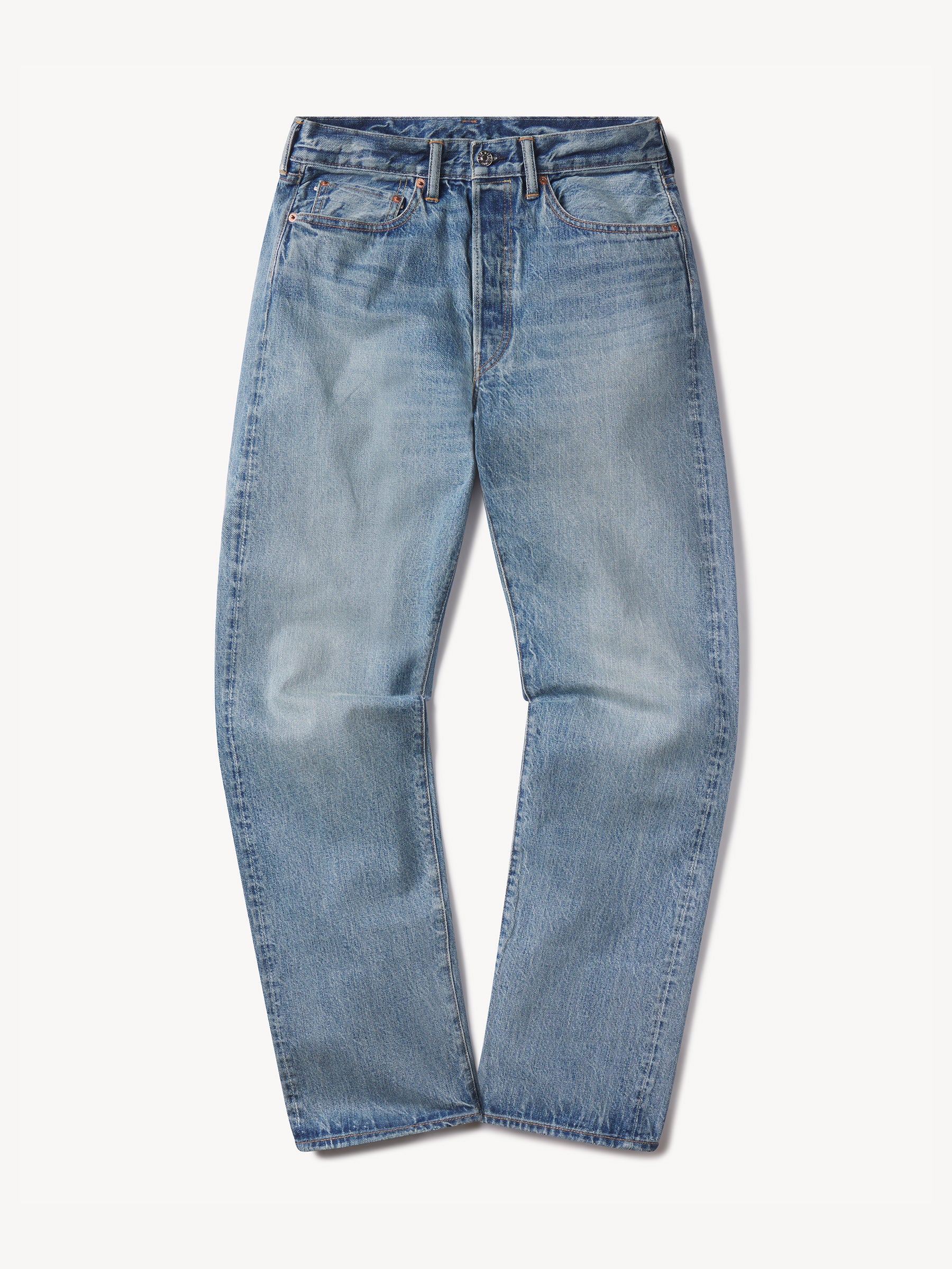 A classic 5-pocket jean in our Cowboy fit: Slightly higher rise with a tailored fit through the thigh and leg. Inspired by blue jeans from the 1940s through the 1960s, this shuttle loomed 14 oz. selvedge denim is unsanforized, and has an organic texture that develops more character with every wear. Garment rinsed for a lived-in feel. Details include copper rivets and a metal tack button fly.