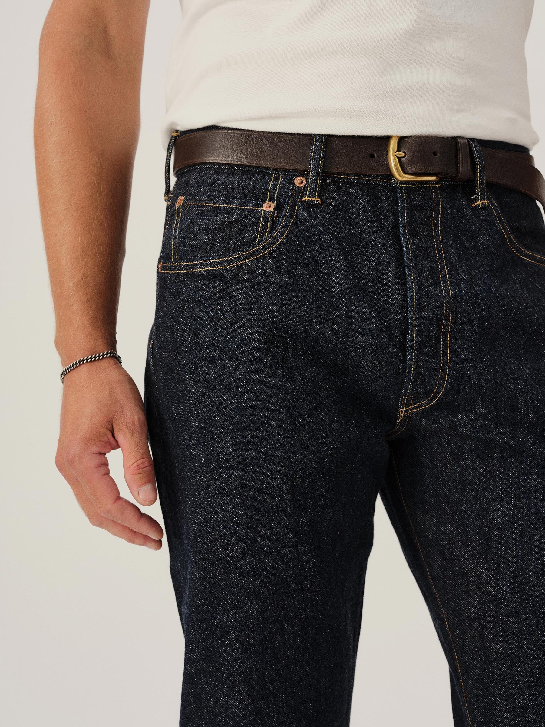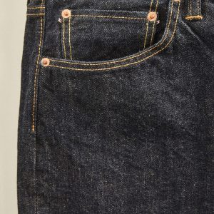 A classic 5-pocket jean in our Ford Standard fit: mid-rise, straight through the thigh with a taper below the knee. Inspired by blue jeans from the 1940s through the 1960s, this shuttle loomed 14 oz. selvedge denim is unsanforized, and has an organic texture that develops more character with every wear. Garment rinsed for a lived-in feel. Details include copper rivets and a metal tack button fly.