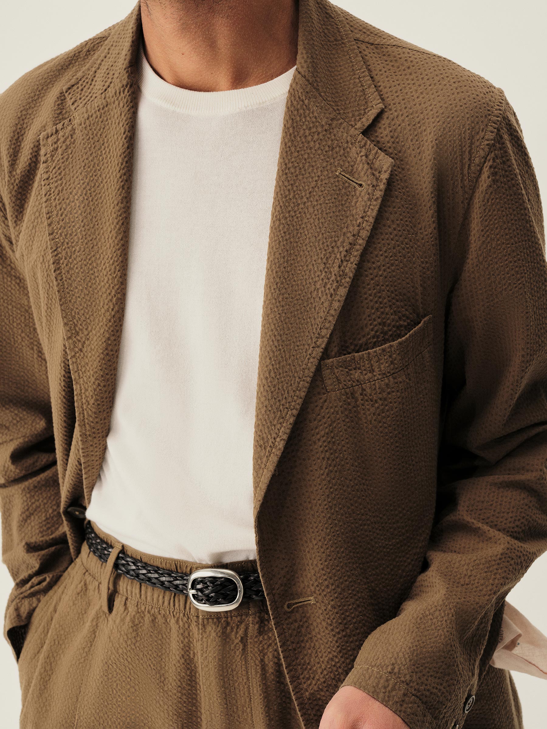 Tailored 3-roll-2 button blazer inspired by timeless vintage suiting. This 5 oz cotton seersucker has a rippled texture that wicks moisture and maintains airflow making it ideal for warmer climates. Details include two patch pockets, two internal welt pockets, and a notched lapel. We left it unlined and omitted the back vent and cuff buttons for a casual, streamlined look. Constructed with hand-linked seams and garment washed with enzymes and softener for a lived-in feel.