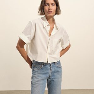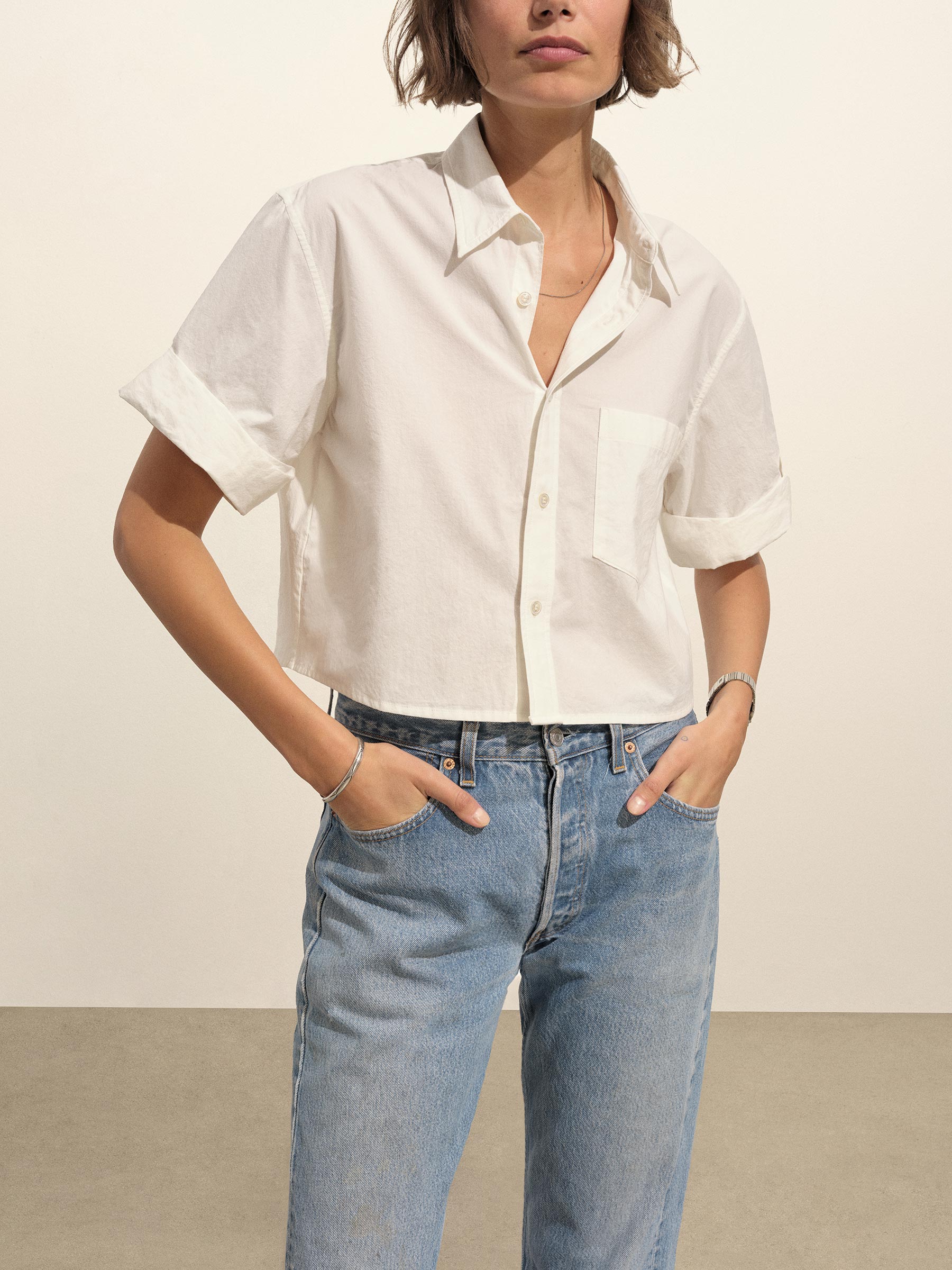 Our Mainstay button-down shirt, reimagined for summer with a 20 ¼” cropped body and rolled sleeves, cut from a lightweight, 2.8 oz. cotton weave. Featuring felled seams and a back yoke with a box pleat. Finished with mother of pearl buttons and garment washed for a broken-in feel.