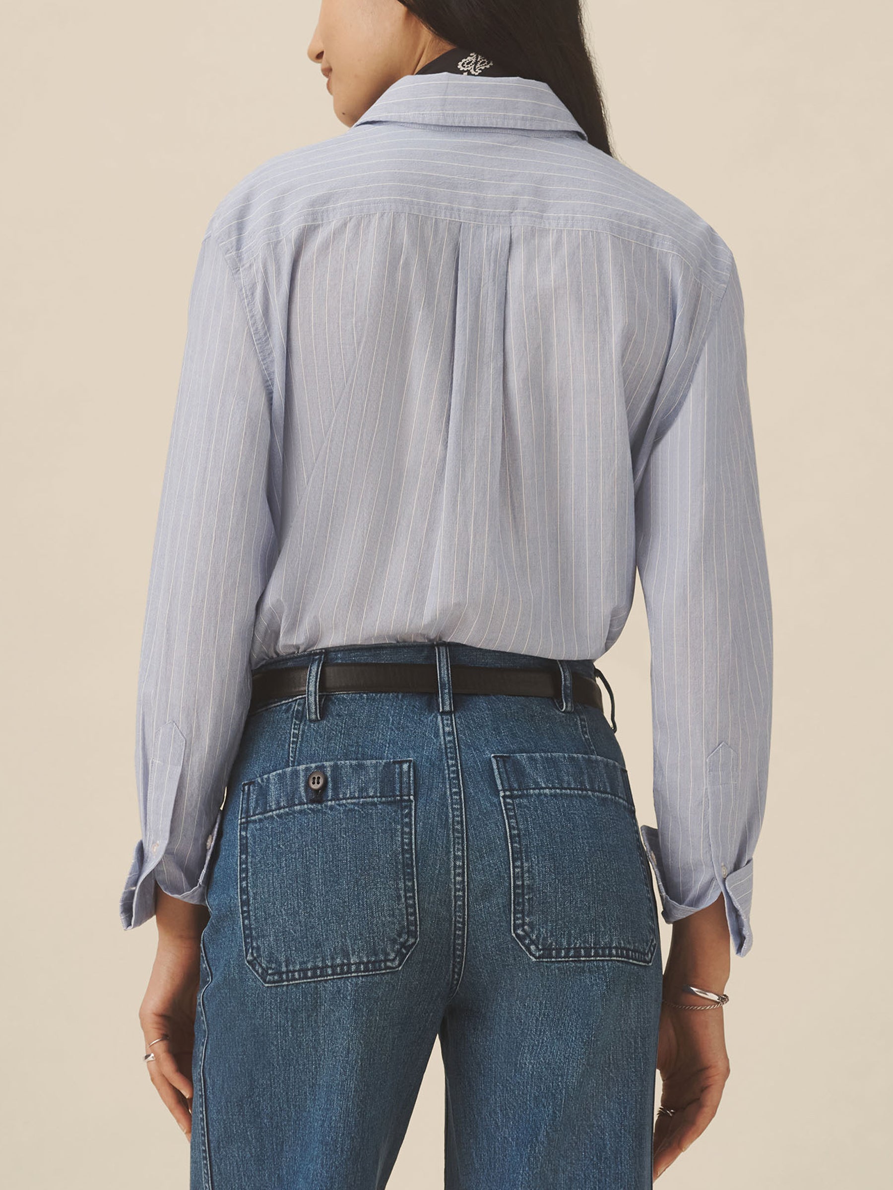 Relaxed button-down shirt in 3.7 oz. cotton plainweave. 29.5” length hits just below the hip. Details include a back yoke with box pleat, a single spade pocket, and pleated cuffs. Inspired by mid-century men’s shirting, this piece can be worn on its own, layered over a tee, or paired with our Rider Pant. Garment washed with softener for a lived-in feel.