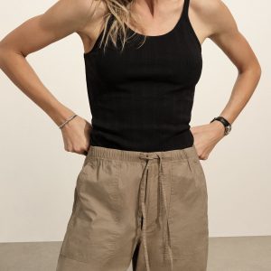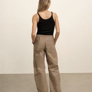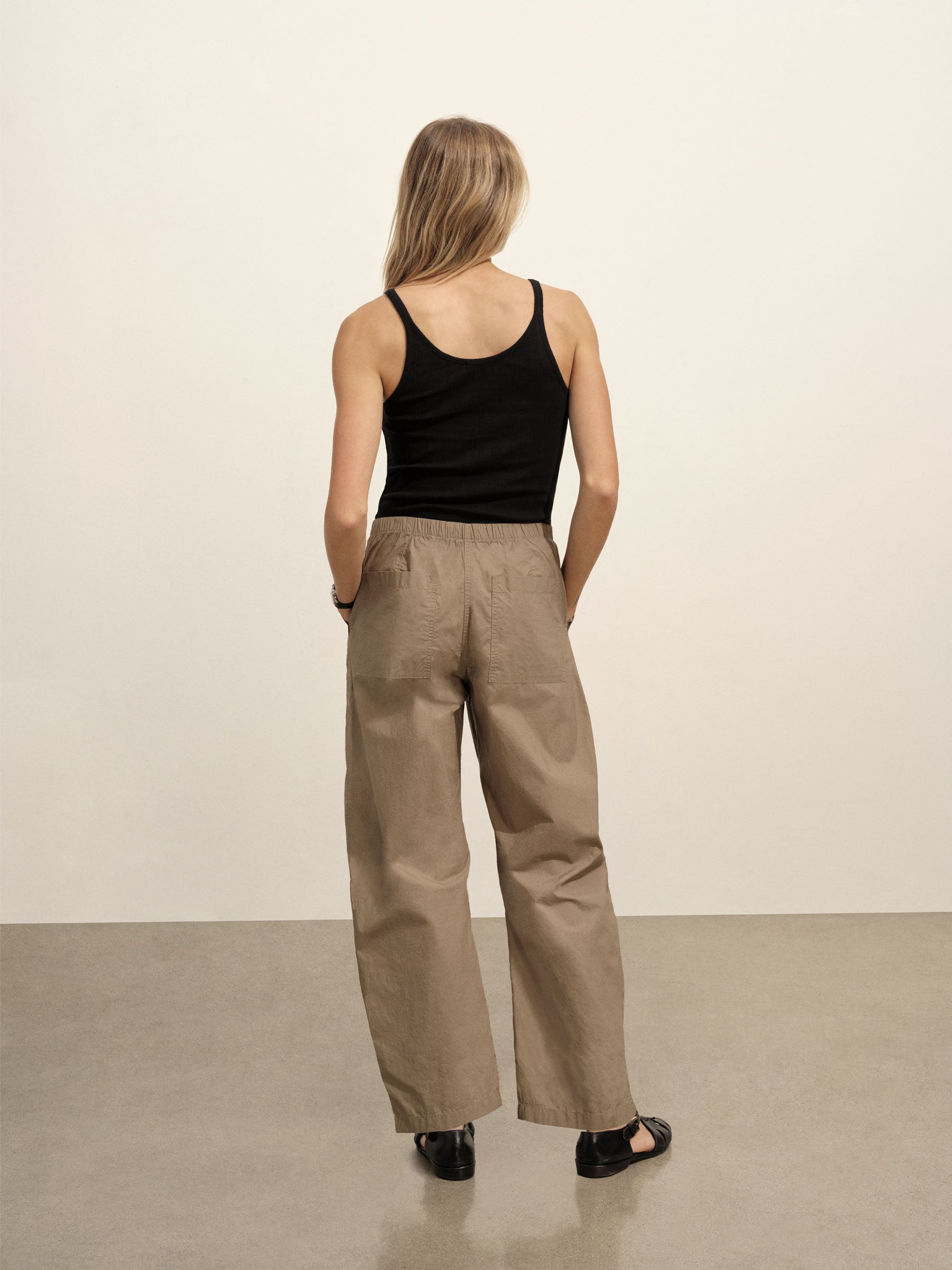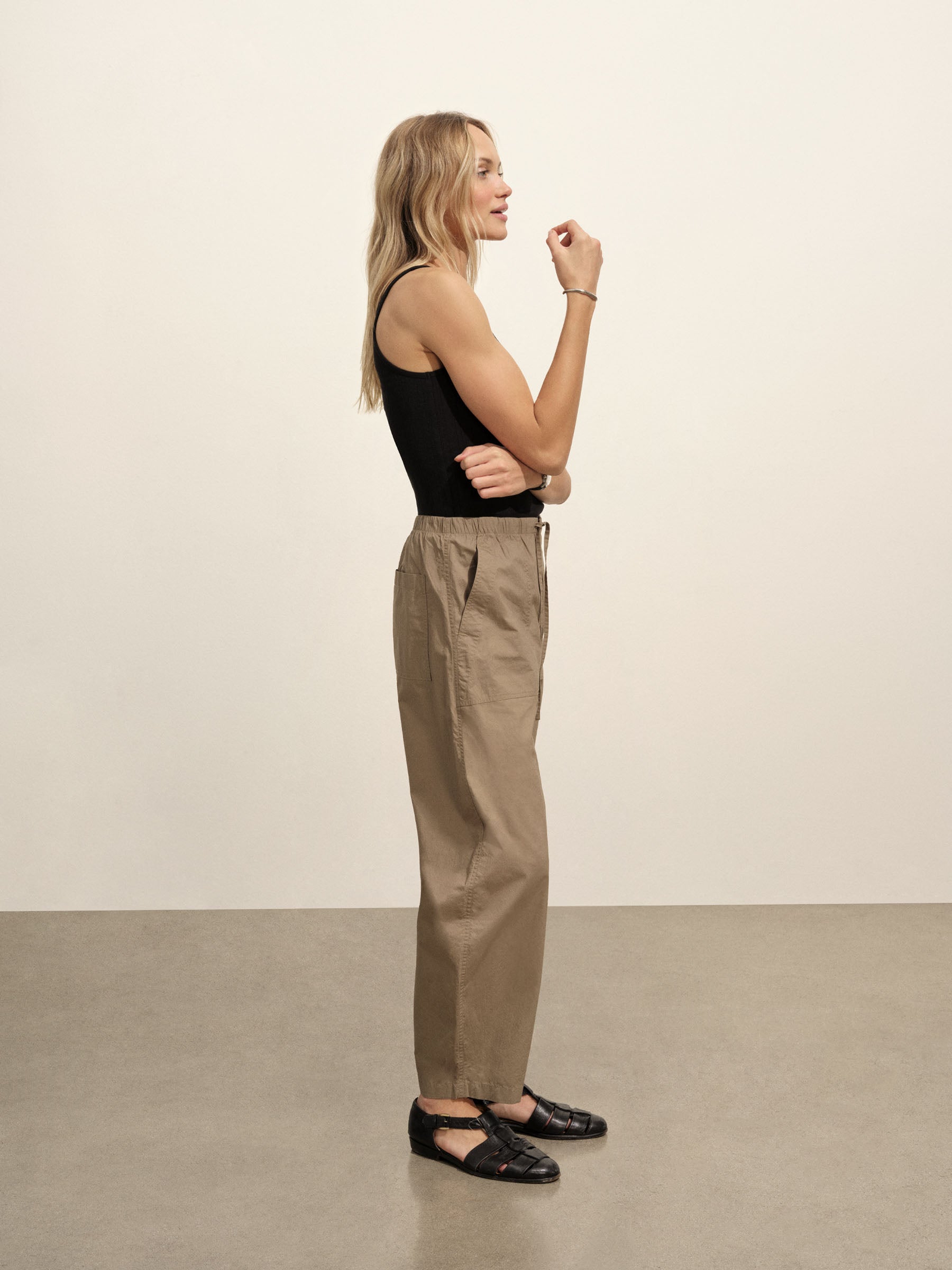 High-rise, military-inspired pant crafted from lightweight cotton poplin with a cropped, 27” inseam and curved barrel legs. Details include two front baker pockets and back patch pockets. Finished with corozo buttons, a zipper fly, and a metal hook and bar with a self-adjusting elastic waistband. Garment-washed for a lived-in feel.