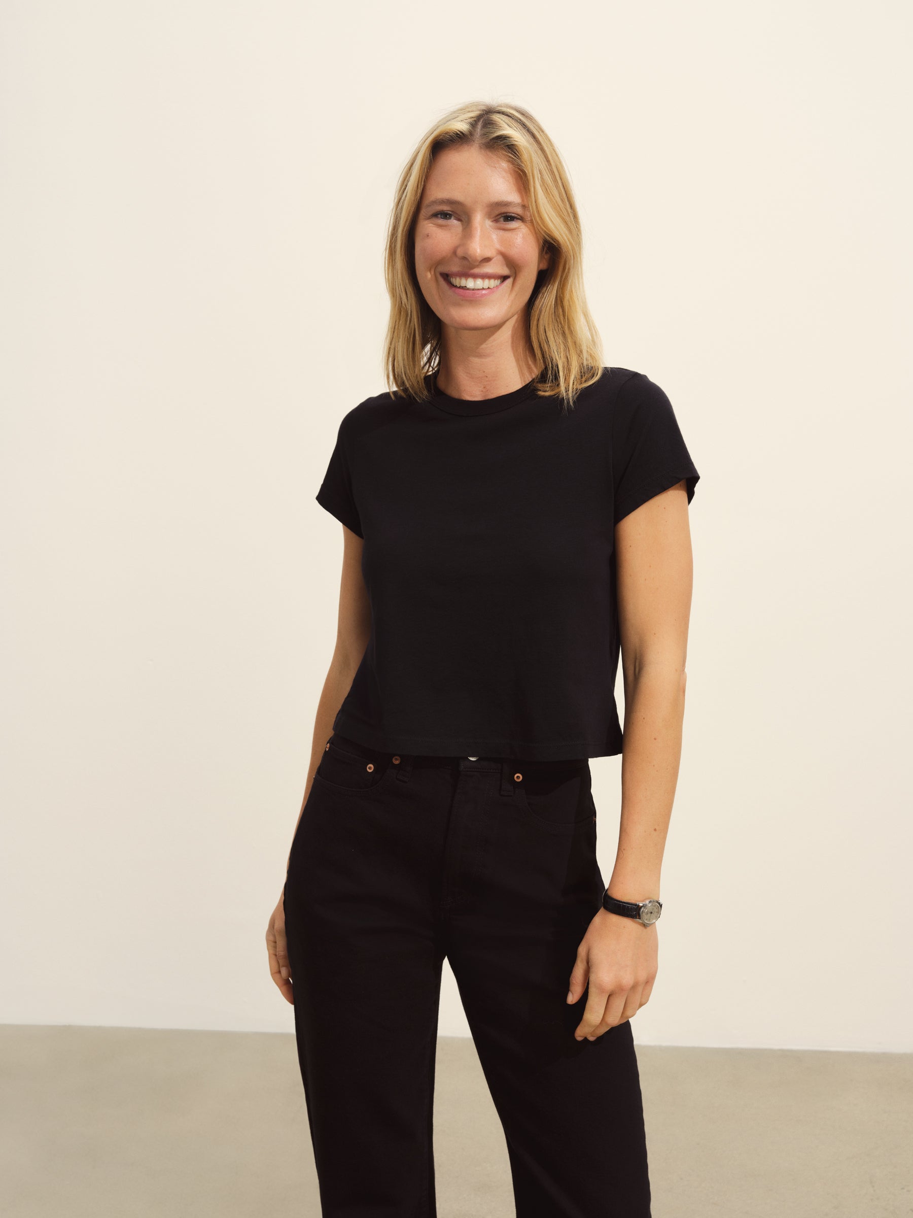Boxy short sleeve crewneck tee with a straight hem. Cut from 120 GSM Supima cotton. Constructed with rib neck binding and double-needle cover-stitching at the hem. Garment washed for a lived-in feel.