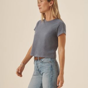 Boxy short sleeve crewneck tee with a straight hem. Cut from 120 GSM Supima cotton. Constructed with rib neck binding and double-needle cover-stitching at the hem. Garment washed for a lived-in feel.