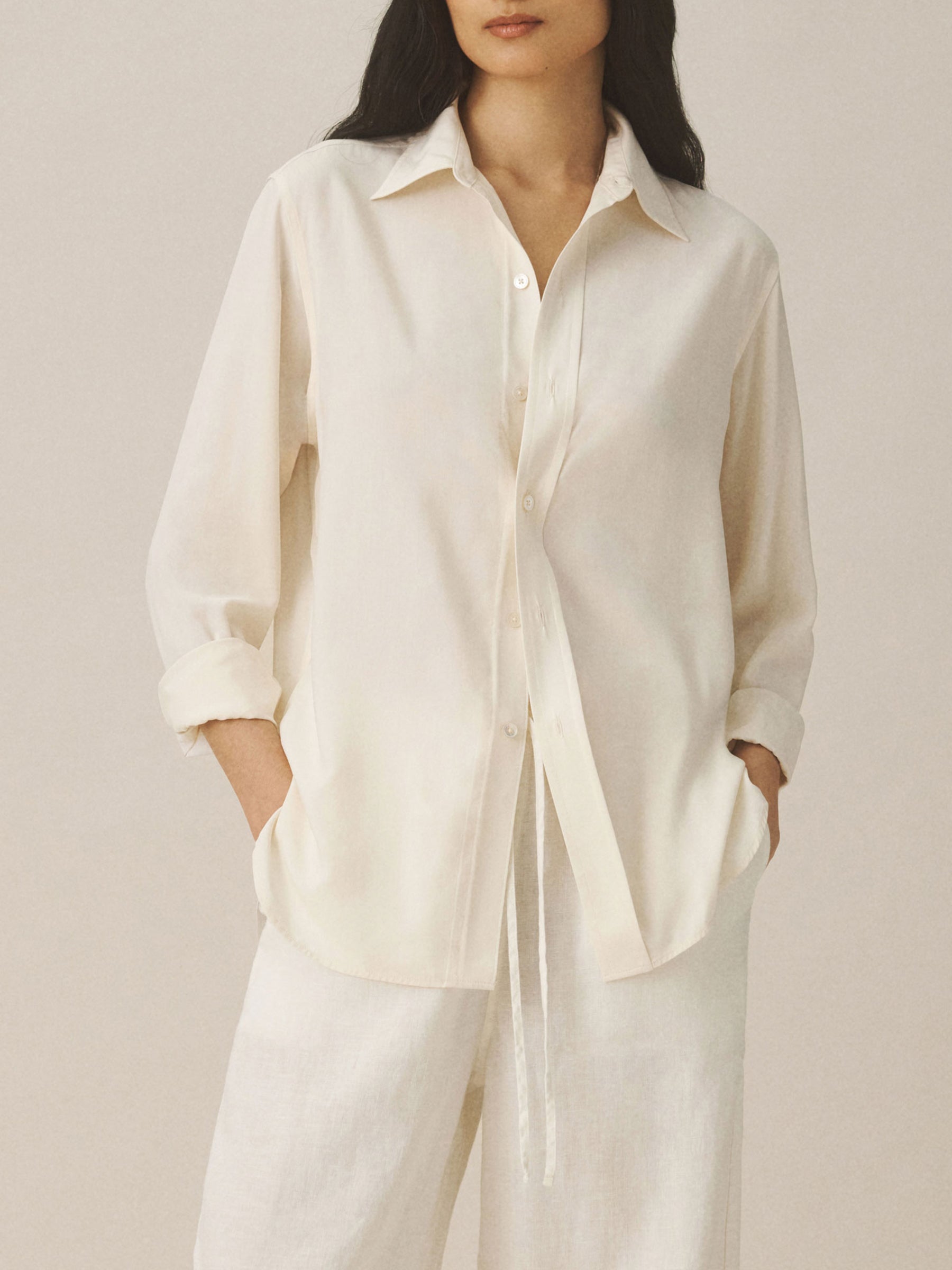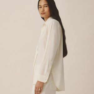 A modern take on men’s sportswear shirts from the 1940s, a relaxed button-down shirt in a silky rayon jacquard weave. Featuring a carved collar, side-seam gussets, button-through plackets along shirt front and sleeves, and pintuck detailing on back yoke and sleeve cuffs. Finished with side-seam gussets and mother of pearl buttons.