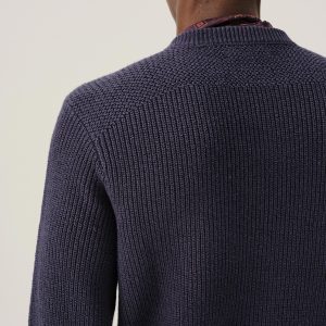 Classic fit crewneck sweater in a homespun textured cotton rib. Constructed with hand-linked seams, double layer ribbing at the collar, and racking stitch detailing at the cuffs.