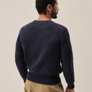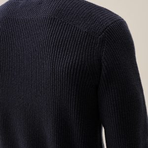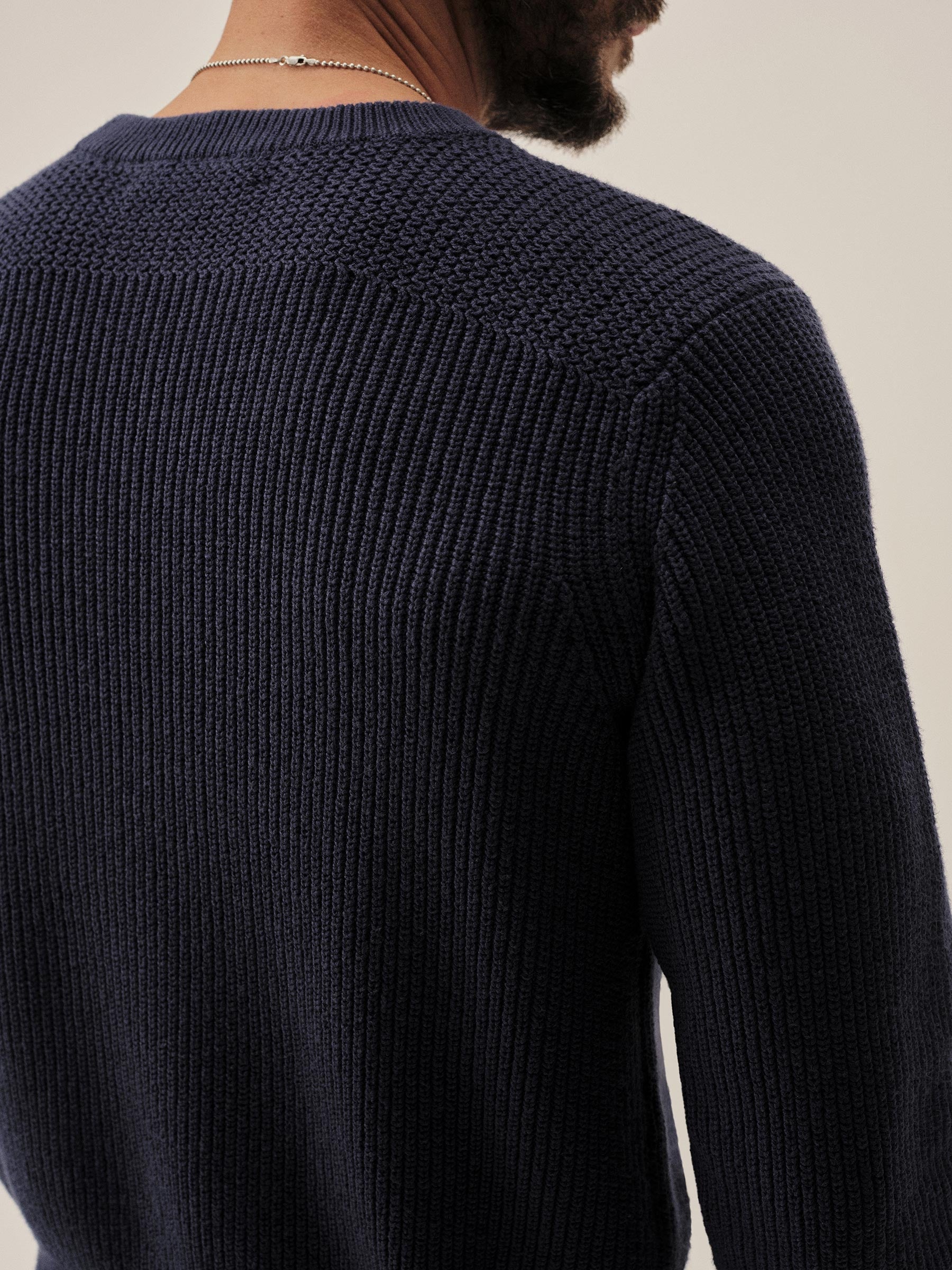 Classic fit crewneck sweater in a homespun textured cotton rib. Constructed with hand-linked seams, double layer ribbing at the collar, and racking stitch detailing at the cuffs.