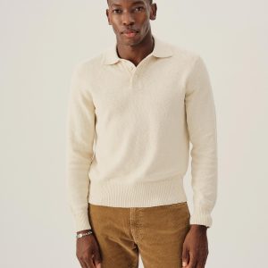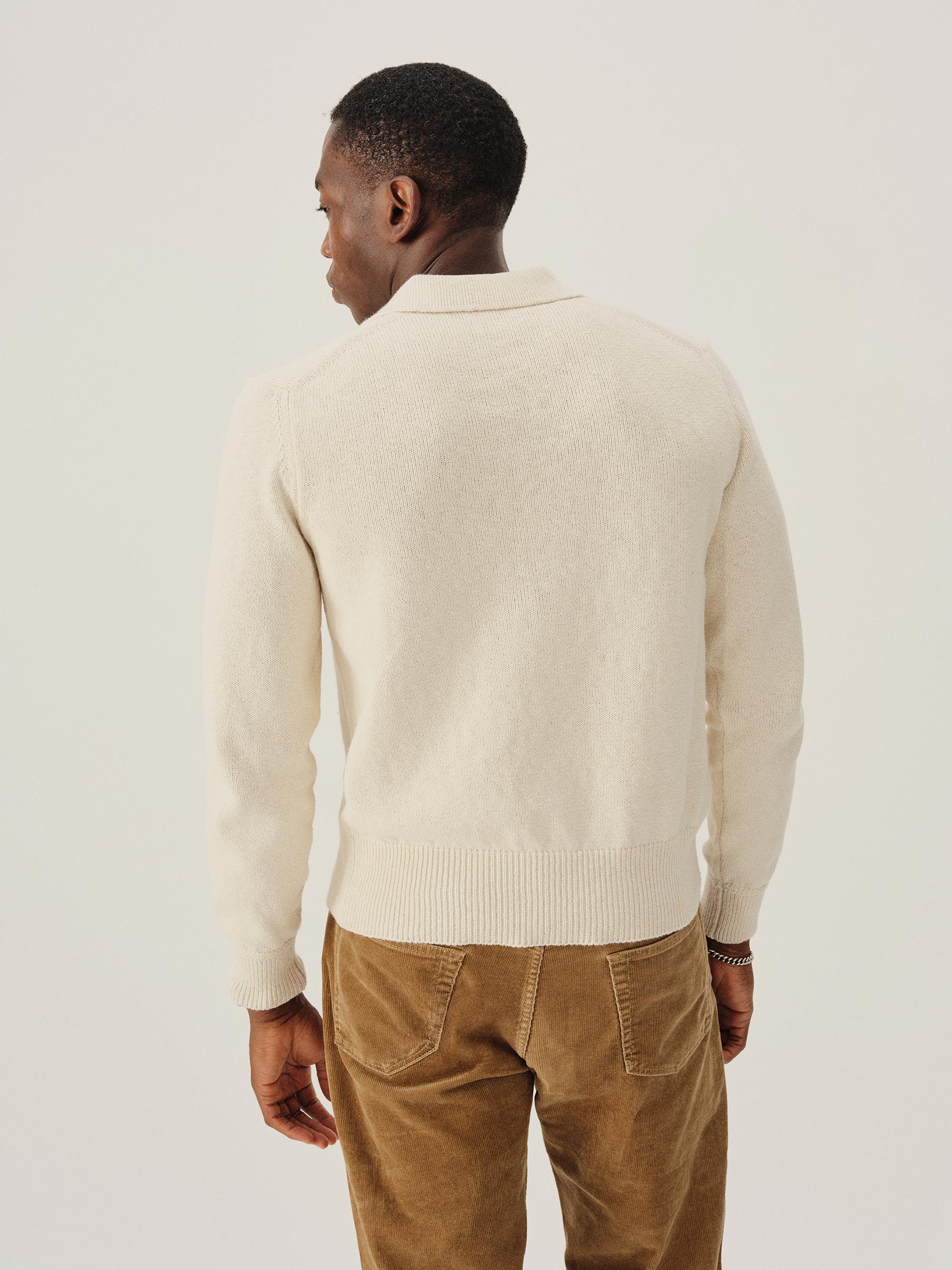 Classic fit polo sweater in a 7 gauge half cardigan rib knit from our homespun yarn-dyed cotton. Features a 3-button rib center front placket with nacre buttons and a rib collar designed to lay flat. Constructed with hand-linked seams and racking stitch detailing at the cuffs.