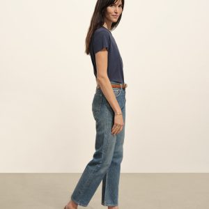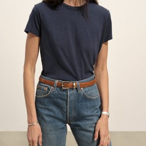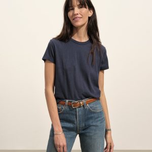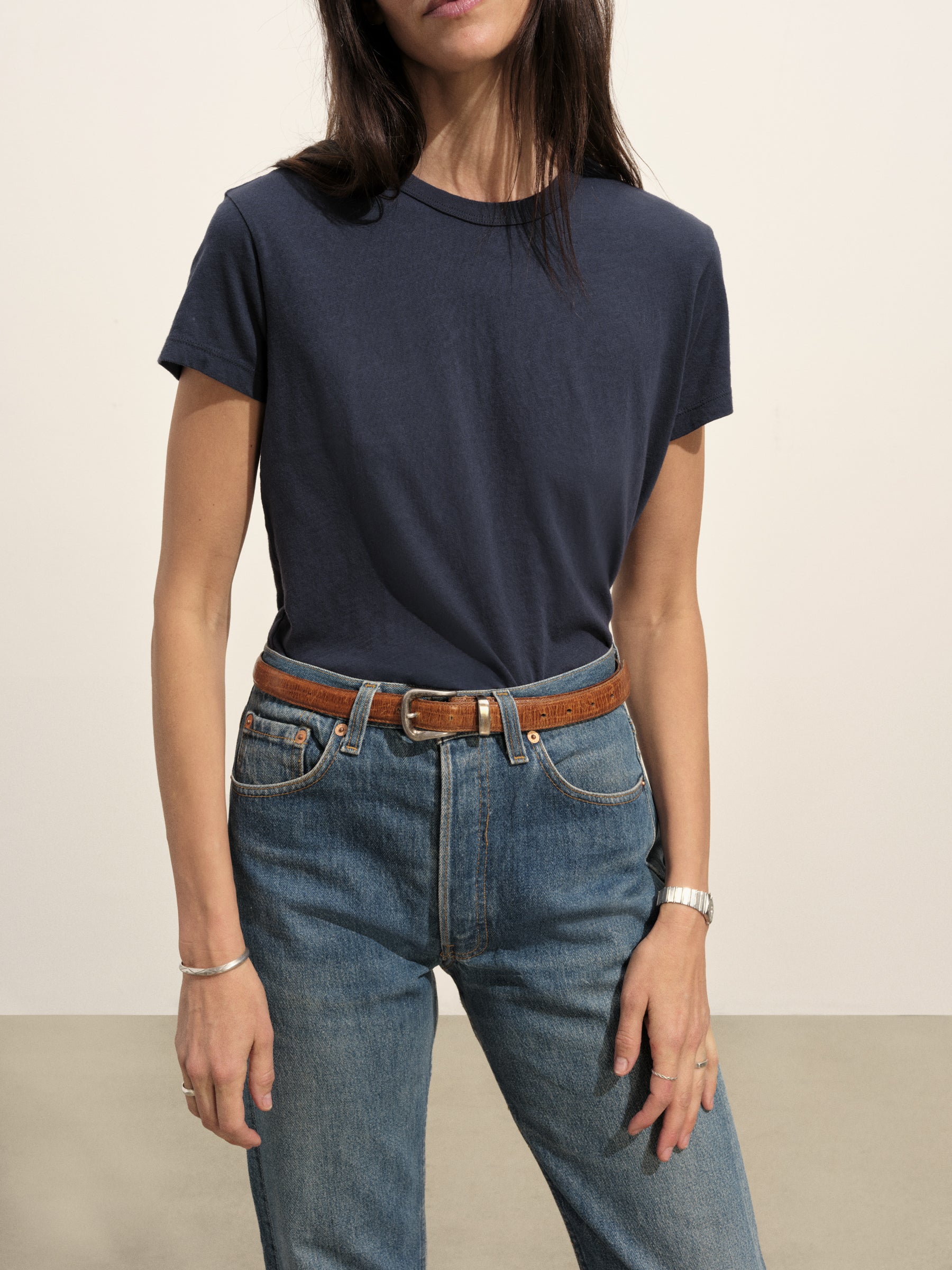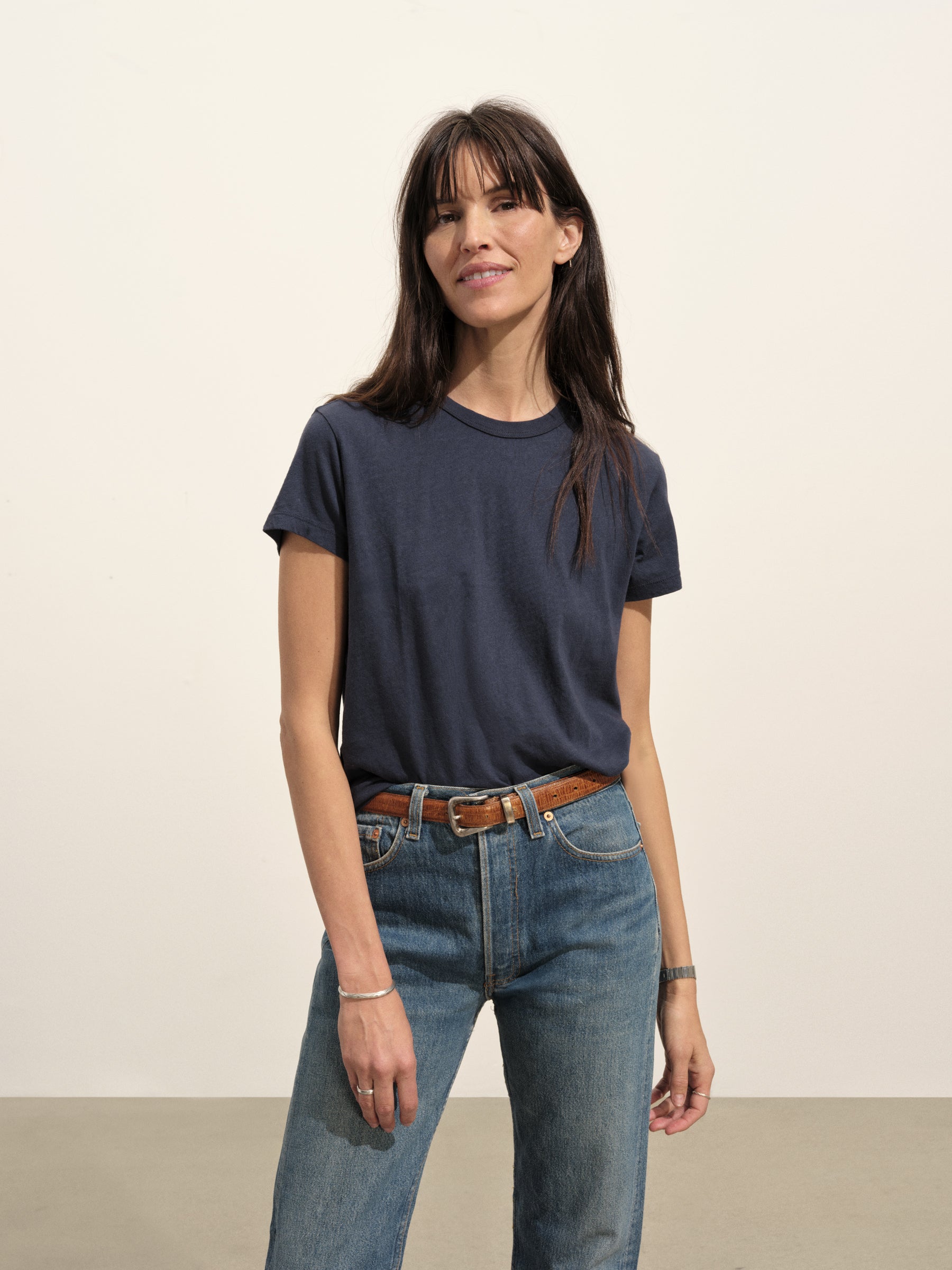 Classic fit short sleeve crewneck tee with a straight hem, cut from 125 GSM cotton with light slub texture. Constructed with self neck binding and ladder stitch detailing at the hems. Garment dyed and washed with softener for a lived in feel.