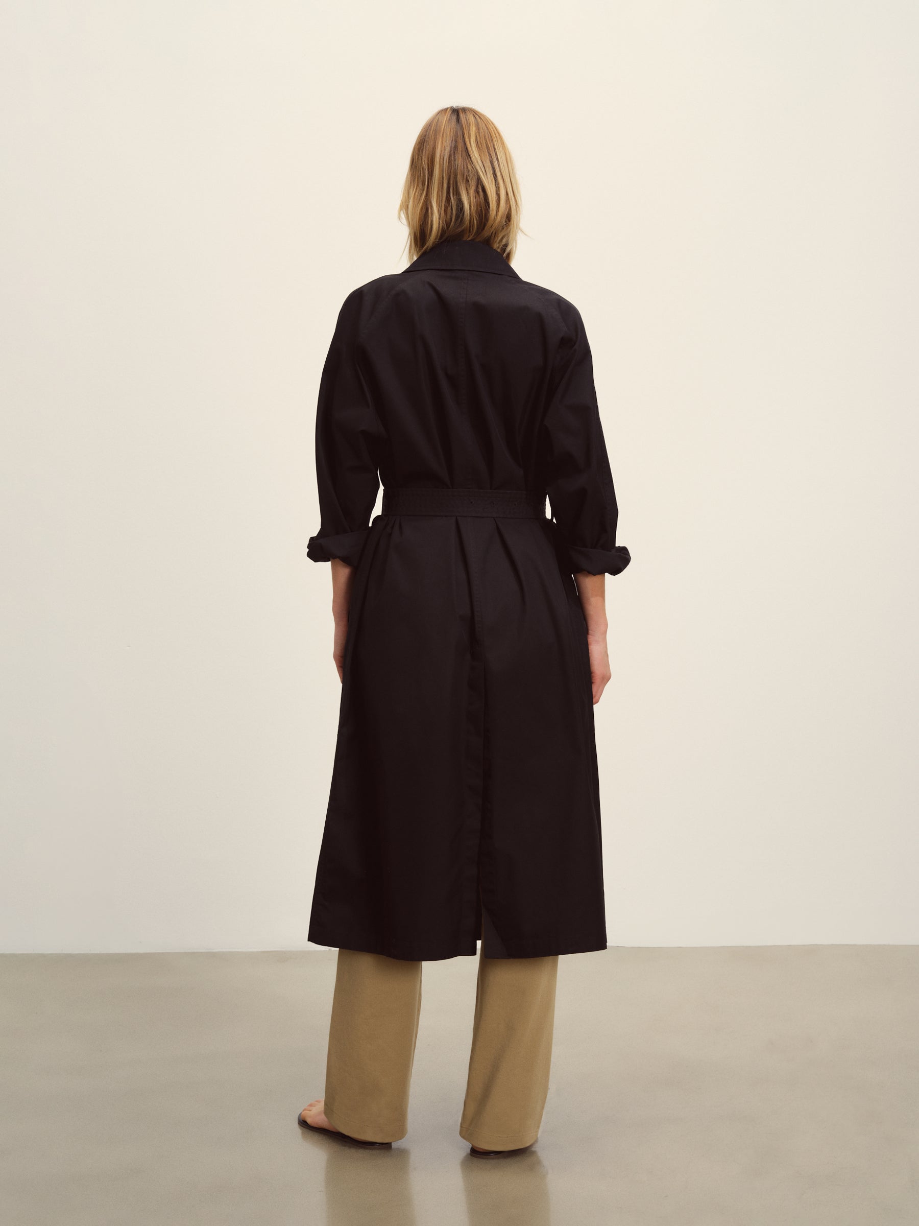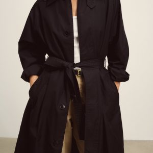 Relaxed, vintage-inspired trench coat cut from 5.7 oz. yarn-dyed cotton/poly twill weather cloth with a DWR finish. Features welt pockets, raglan sleeves, and a deep back vent. Details include a collar tab, button and tab cuffs, and a removable belt with leather buckle for cinching the waist. Size down for a more fitted silhouette.