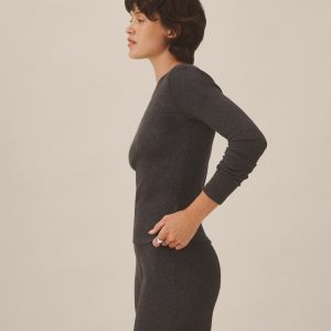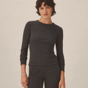 Slim fit ribbed long sleeve tee cut from 295 GSM stretch cotton that holds its shape. 2×2 rib structure—two rows of rib stitch, two rows of jersey stitch—is offset by contrast 1×1 rib at the neck. Constructed with coverstitching throughout and flatlock stitching at the side seams. Garment washed for a lived-in feel.