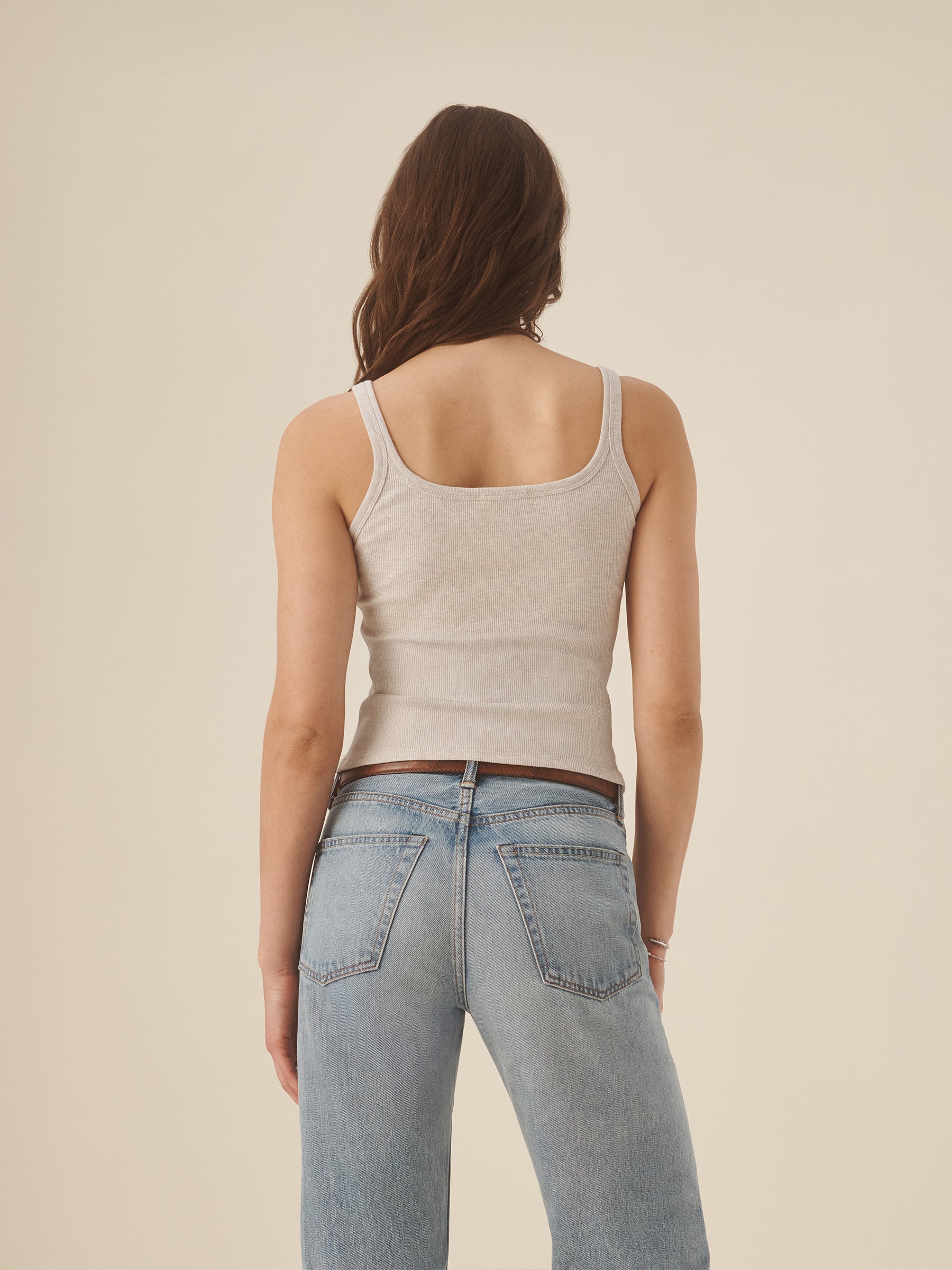Slim fit ribbed scoop neck tank cut from 295 GSM stretch cotton that holds its shape. 2×2 rib structure—two rows of rib stitch, two rows of jersey stitch—is offset by contrast 1×1 rib at the neck. Constructed with coverstitching throughout and flatlock stitching at the side seams. Garment washed for a lived-in feel.