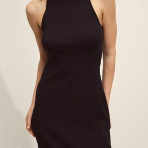 Slim fit tank dress that falls straight from the hip to hit below the calf in a 54″ length. An easy silhouette in 295 GSM stretch cotton that holds its shape. 2×2 rib structure—two rows of rib stitch, two rows of jersey stitch—is offset by contrast 1×1 ribbing at the neck. Features a hidden thread chain and snap at each shoulder to hold bra straps in place. Constructed with flatlock stitching throughout and double needle coverstitching at the hem. Garment washed for a lived-in feel.