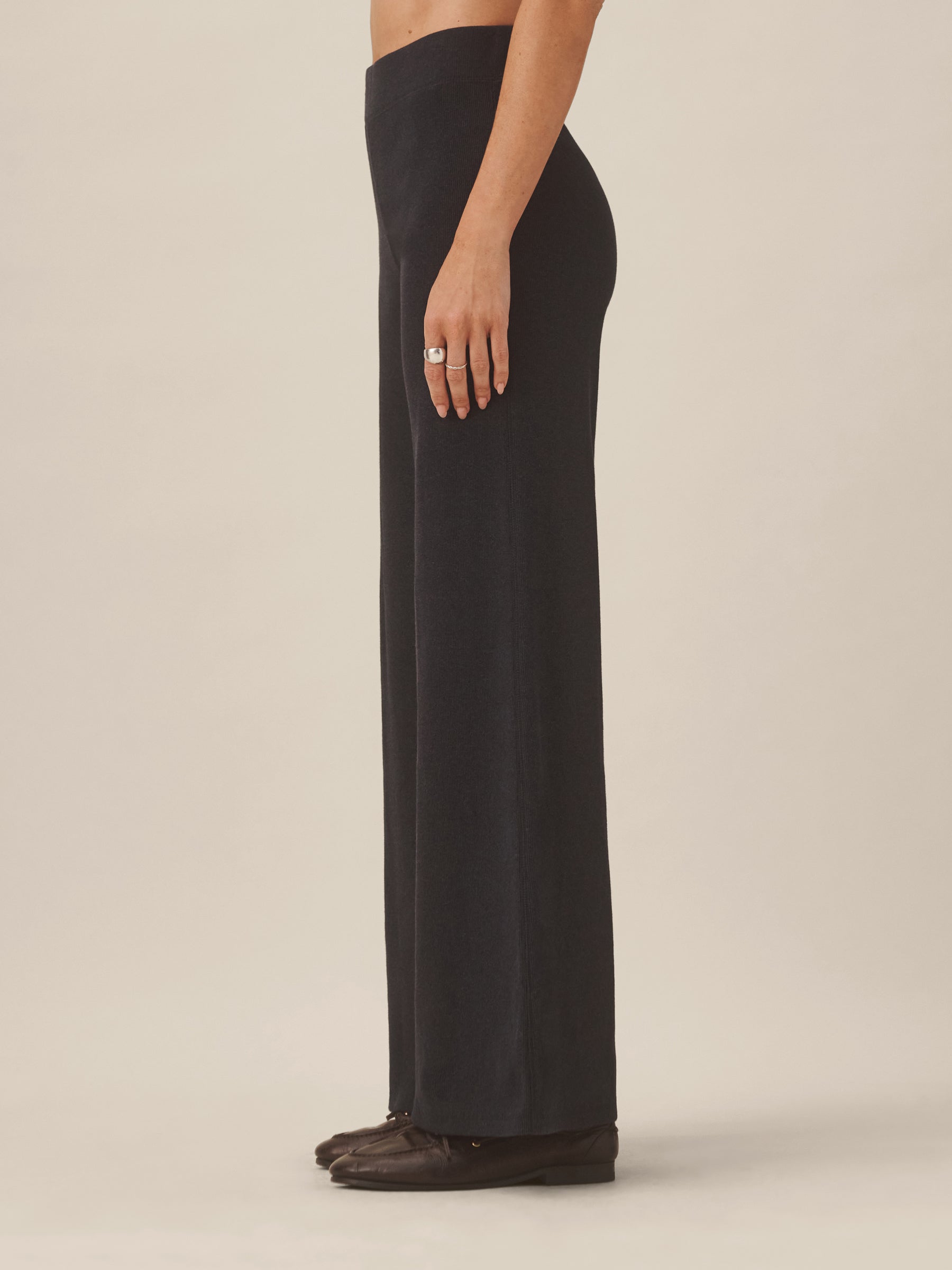 Straight leg, high-waisted 2×2 rib knit pant cut from 295 GSM stretch cotton that holds it shape. Fits comfortably at the waist with a wide elastic waistband with a full length inseam measuring 31 3/4”. Garment washed for a lived-in feel.
