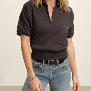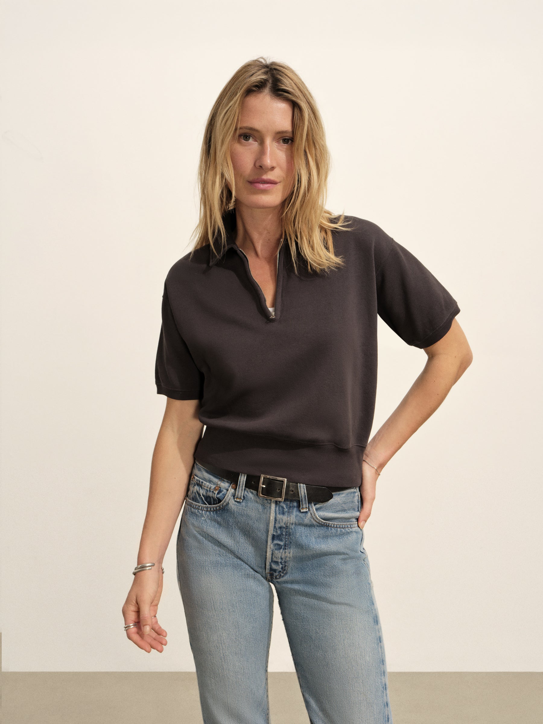 Oversized, quarter-zip sweatshirt that sits below the waist. Features an off-shoulder fit with rib-banded cuffs and hem.