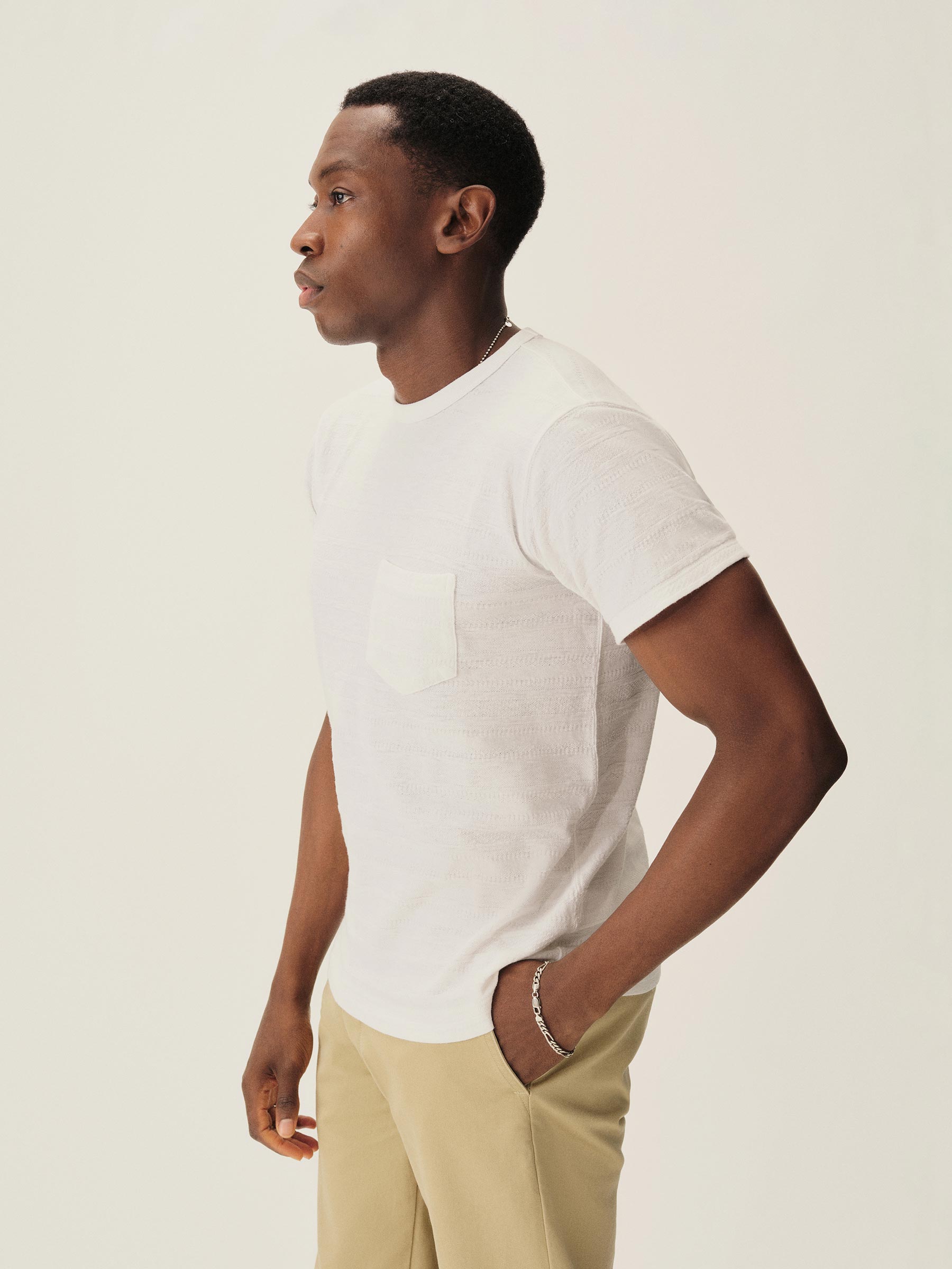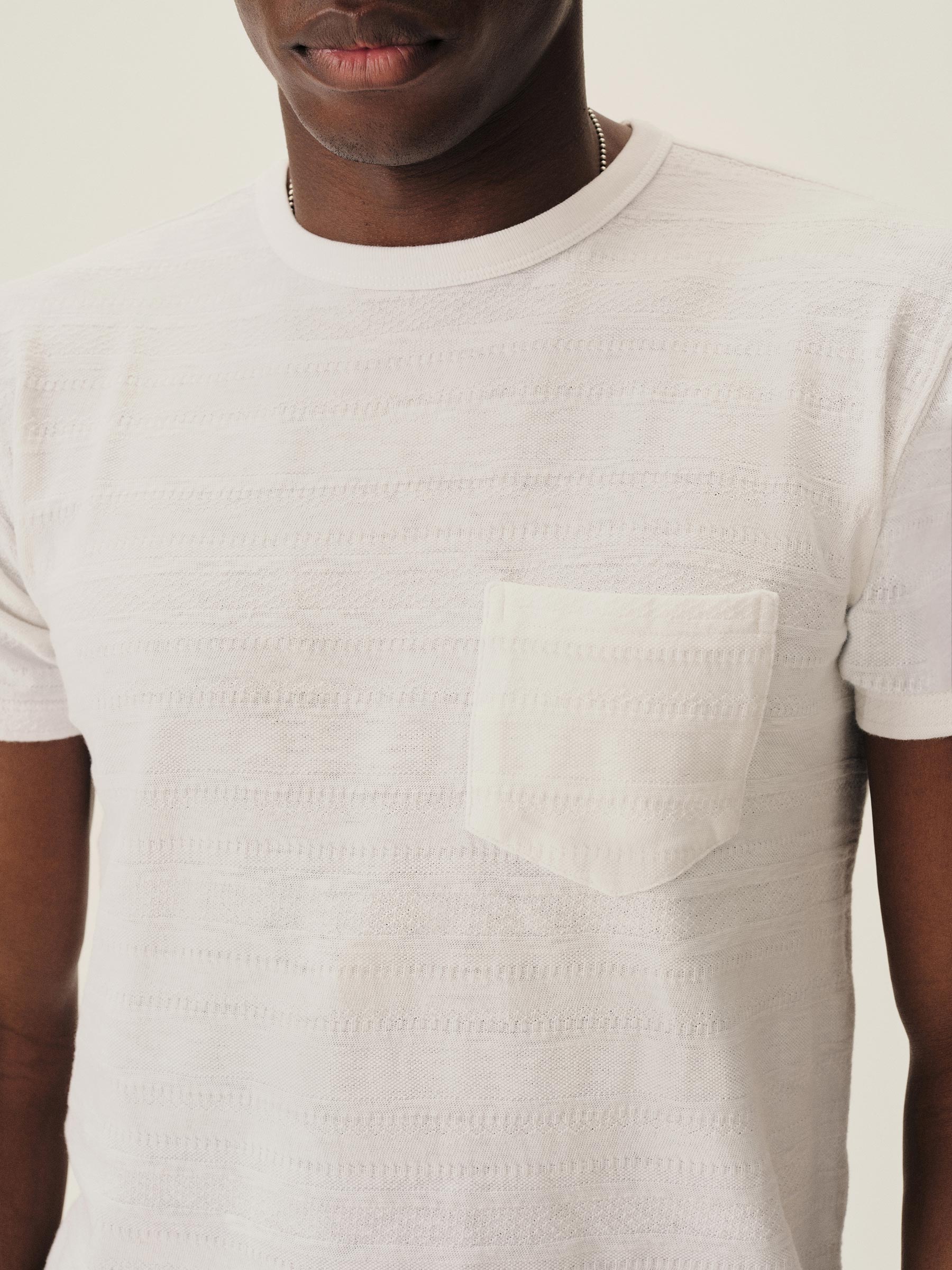Classic fit short sleeve crewneck tee with a straight hem and patch chest pocket. Cut from a midweight cotton with tonal jacquard patterning. Garment washed for a lived-in feel.