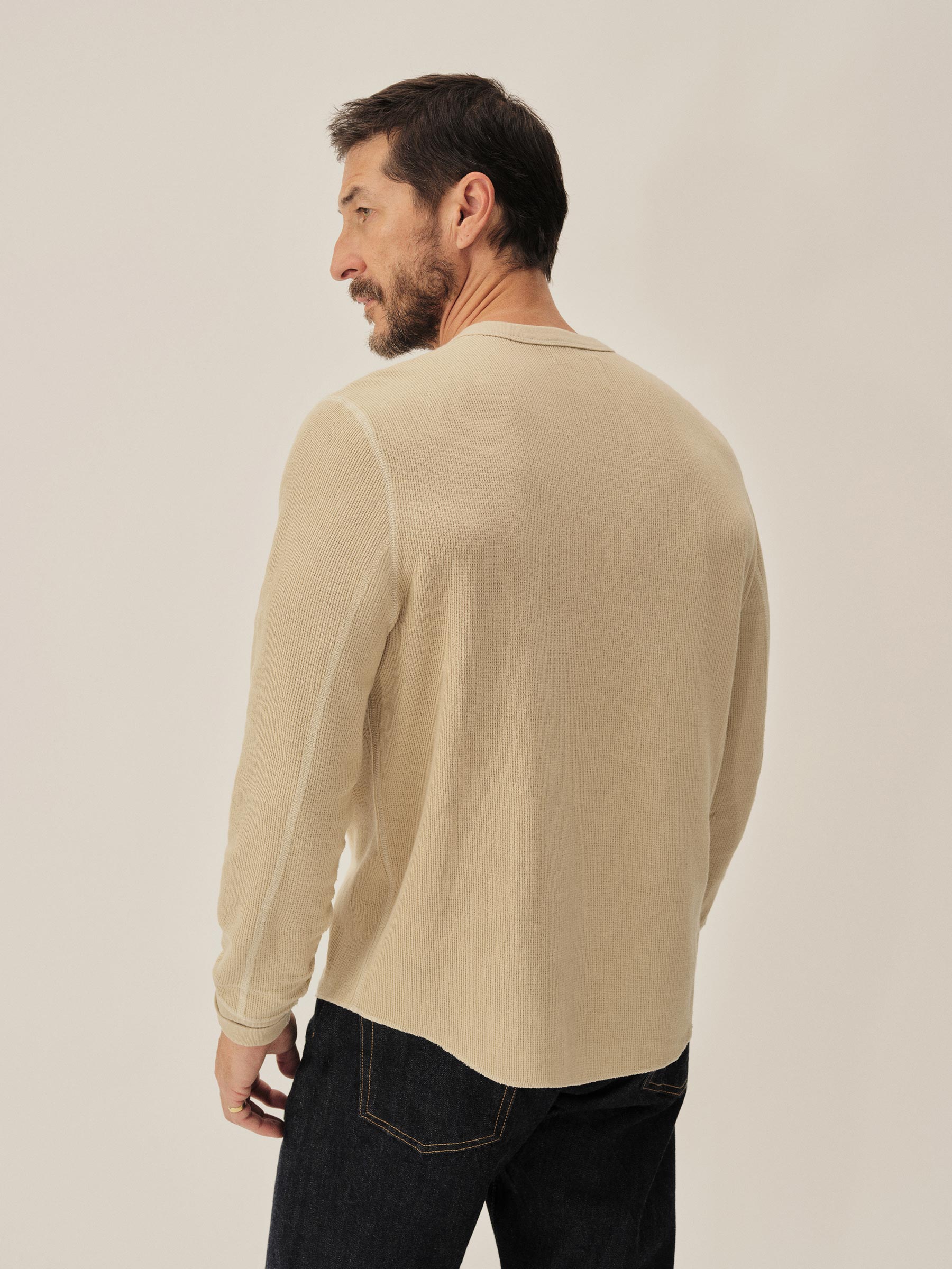 Classic fit thermal long sleeve crewneck tee with our signature curved hem. This 250 GSM French rib cotton double knit features a waffle-knit face and a smooth jersey back. Constructed with ribbed cuffs and flat-lock stitching throughout for improved comfort and durability. Garment washed with enzymes and softener for a lived-in feel.