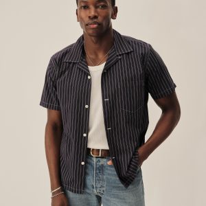 Classic fit short sleeve camp collar button up cut from a mercerized 4 oz. washed cotton. Features a four-button placket with mother of pearl buttons, a single spade chest pocket, and a loop and button closure at the neck. Constructed with clean finished seams. Garment washed with enzymes for a lived-in feel.