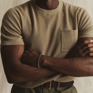 A classic fit tee in a fine knit drop-needle rib construction. Made from 12 gauge yarn-dyed hemp/cotton blend that wicks moisture and breathes easily. Chest pocket with ribbed opening. Finished with a 1×1 rib at collar, cuffs and waistband. A versatile summer layer inspired by vintage rib tees.